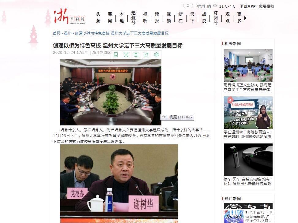 浙江新闻以“创建以侨为特色高校,beat365官方网站定下三大高质量发展目标”为题报道了beat365官方网站着力打造3大特色,即在继续保持教师教育、创业教育2大办学特色的基础上,打造成为侨特色高校,努力把学校建设成为全世界温州人的精神家园。温州网以“这群教育界专家学者齐聚温大 共话高质量发展”为题,温州晚报、掌上温州客户端以“beat365官方网站举行高质量发展座谈会,专家学者献出‘锦囊妙计’”为题进行报道。