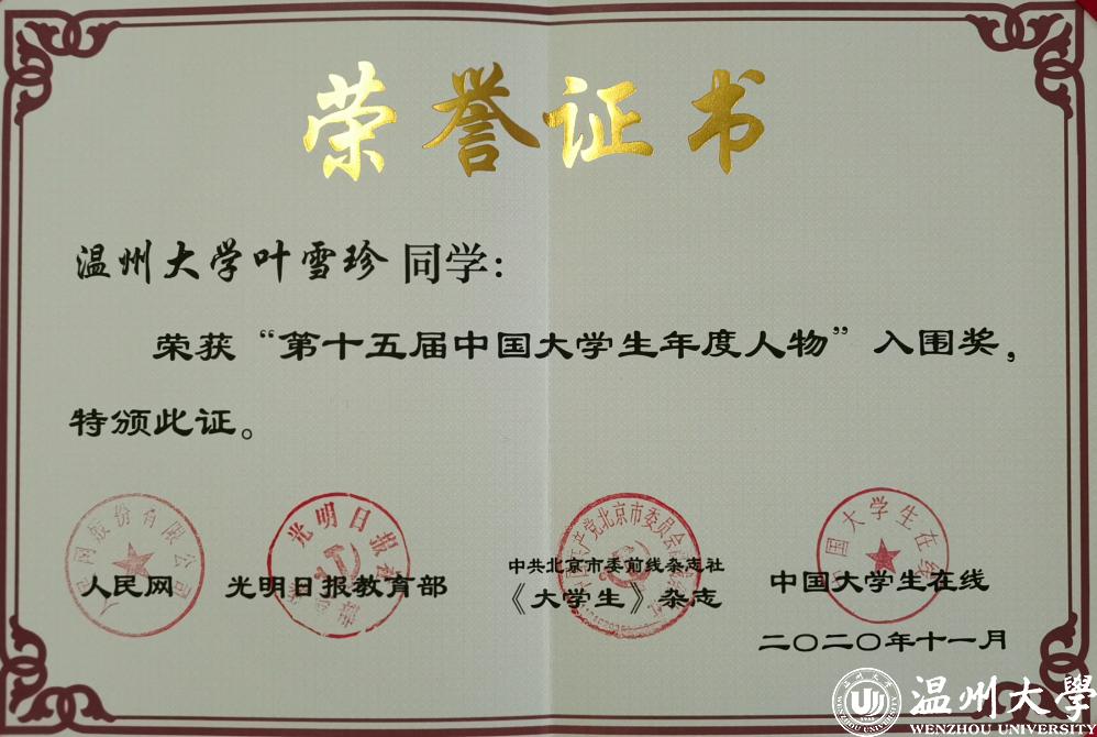 日前,由教育部、人民日报社共同指导,人民网、光明日报社教育部、《大学生》杂志、中国大学生在线联合主办“第十五届中国大学生年度人物” 推选展示结果揭晓,beat365教育学院叶雪珍同学荣获“第十五届中国大学生年度人物”入围奖。