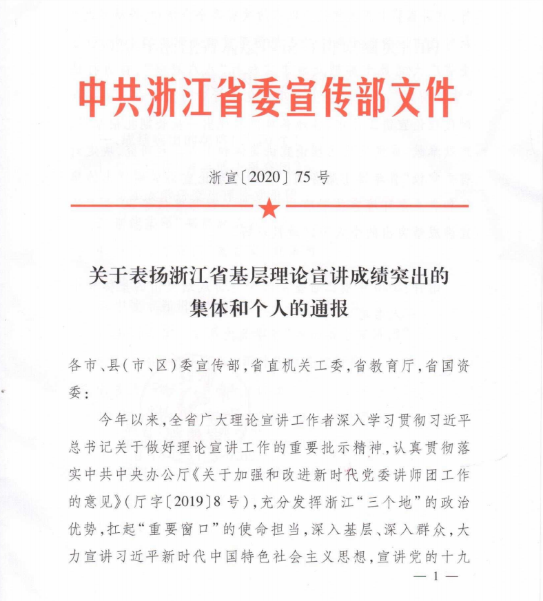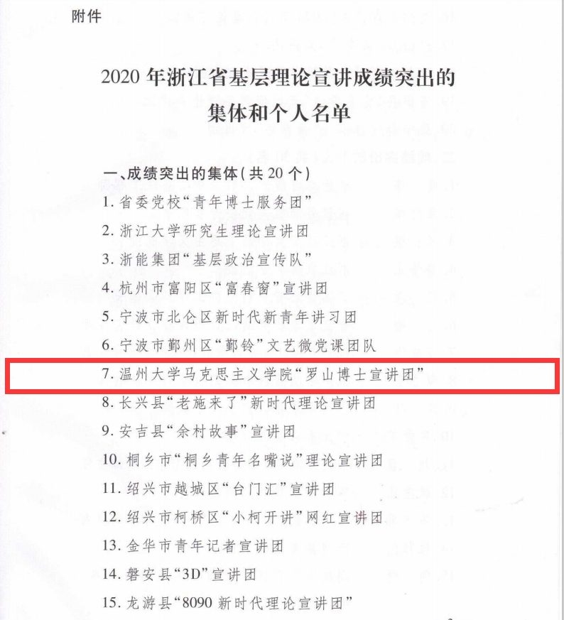 近日,从省委宣传部获悉,beat365马克思主义学院“罗山博士宣讲团”荣获2020年浙江省基层理论宣讲成绩突出集体(浙宣2020 (75)号文件),全省高校仅浙江大学和beat365获奖。