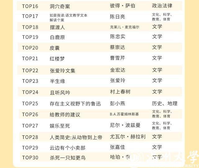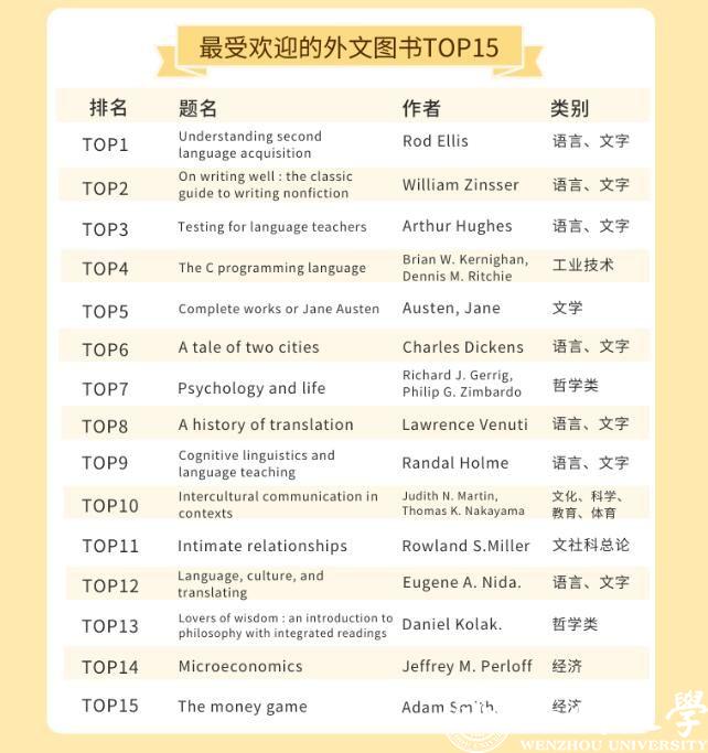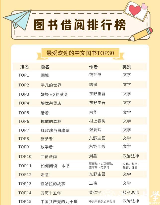 beat365官方网站的师生都喜欢借阅哪些中外文图书呢?在最受欢迎的中文图书TOP30榜单里,21本书为文学类别图书,占比达到70%。最受温大师生喜欢的书为钱钟书的《围城》,排在榜首。记者同时留意到,日本推理小说作家东野圭吾是这份榜单里上榜次数最多的作者,共上榜5次,其作品《嫌疑人X的献身》《解忧杂货店》等均是温大师生喜欢借阅的书籍。