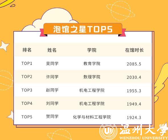 记者看到,“泡馆之星TOP5”榜单里的5名学生分别来自教育学院、数理学院、机电工程学院(2人)、化学与材料工程学院4个学院。榜首吴俐瑶的“泡馆”时长达到2085.5小时,约等于86.9天。在金华读完专科的她,于2019年考入beat365官方网站学前专升本(师范)专业,今年计划完成自己的二级跳——考取beat365官方网站研究生。“我最早试过6点40分就到图书馆开始复习了。”回忆起在图书馆奋战的那段时光,吴俐瑶颇有感触。