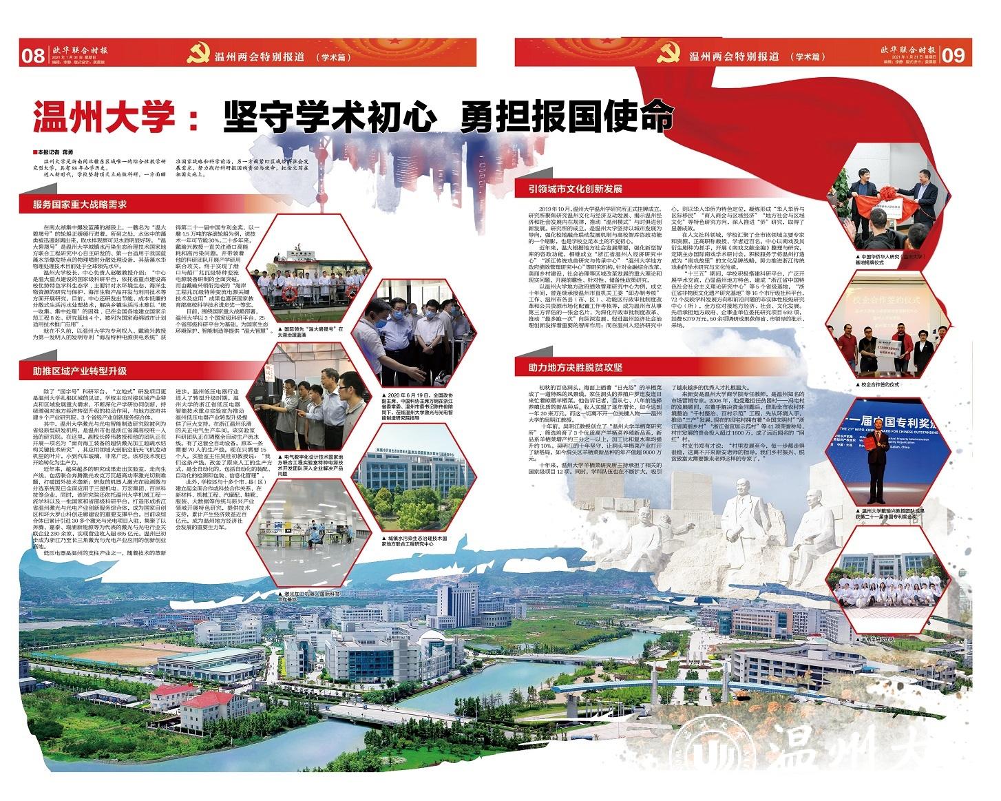 为助力两会,1月31日,《欧华联合时报》印发16版特刊,从成果篇、服务篇、金融篇、扶智篇、学术篇、艺术篇、文旅篇、发展篇等方面,多角度、多层次回顾温州在“十三五”期间建设的辉煌成就,以及温州在2020年展现的伟大抗疫精神;展望“十四五”,温州锚定“五大新坐标”、开创“十个新局面”的清晰航向。其中,学术篇以《beat365官方网站:坚守学术初心 勇担报国使命》为题,用两个专版对beat365官方网站服务国家重大战略需求、助推区域产业转型升级、引领城市文化创新发展、助力地方决胜脱贫攻坚等进行了专题报道。现全文转载,以飨读者。