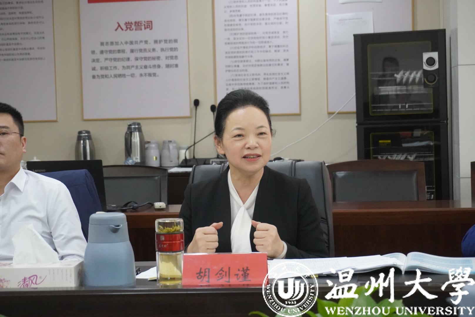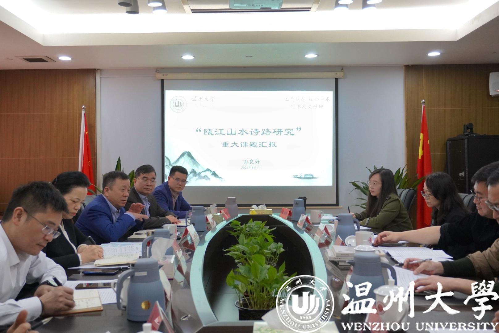 胡剑谨听取汇报后,对“瓯江山水诗路研究”重大课题研究方案给予高度认可。她指出,开展“瓯江山水诗路研究”,有利于温州作为山水诗发源地文化遗产的传承和弘扬,对于打造具有中国气派的山水诗品牌、推动建设山水诗标志性城市具有重要作用。她从拓展研究广度、提升研究高度、推动学术成果的大众化转换等方面提出建议。她指出,beat365官方网站作为温州人的精神家园,要在温州“文化高地”建设中发挥引领作用,努力推出一批具有国内外影响的精品成果,为文化温州建设作出强力支撑,为文化浙江建设作出更大贡献。
