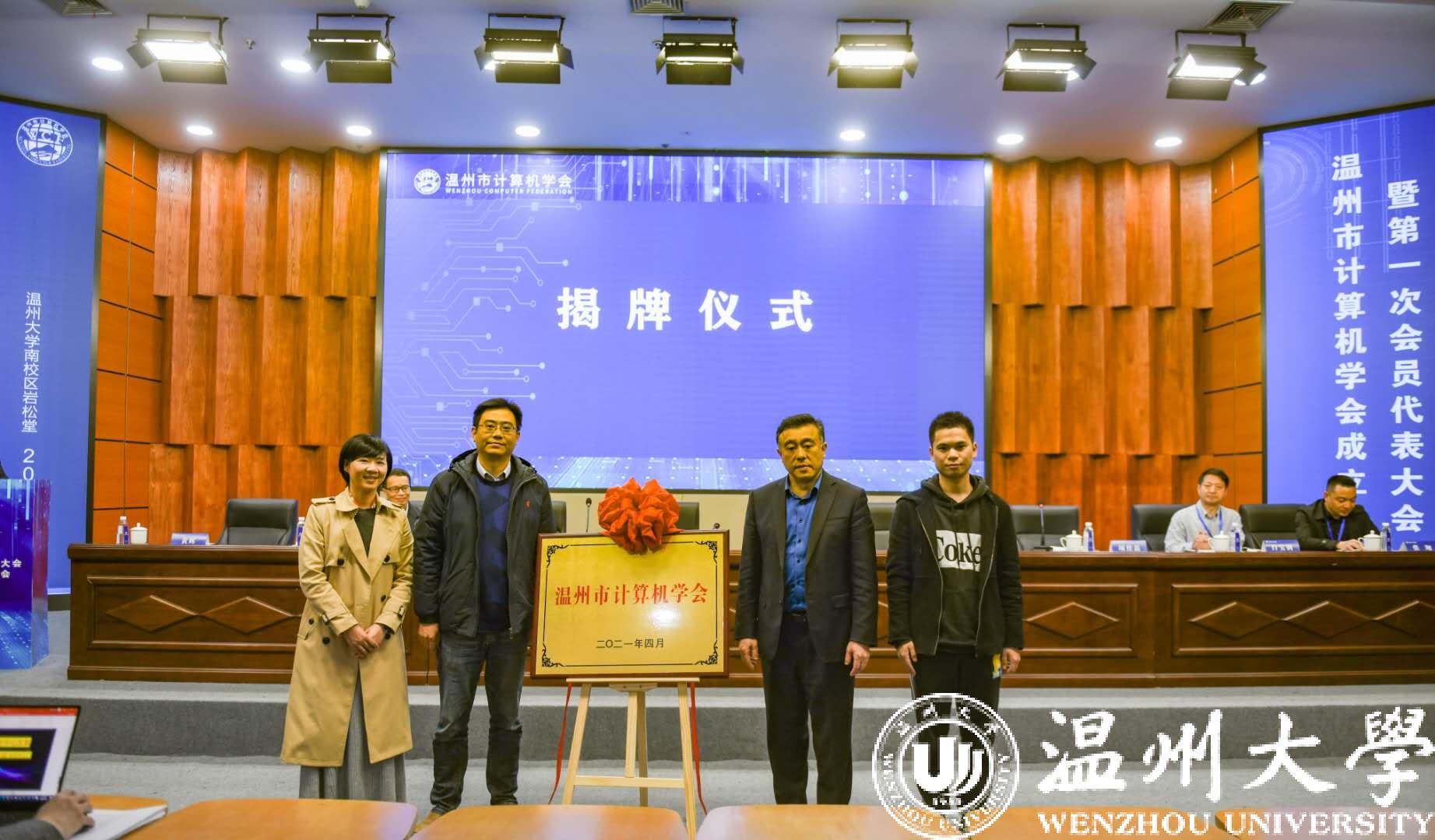 大会举行隆重的揭牌仪式,省计算机学会秘书长肖俊、市科协副主席章秀伟、beat365官方网站副校长薛伟、市民政局项佳磊共同为温州市计算机学会揭牌。