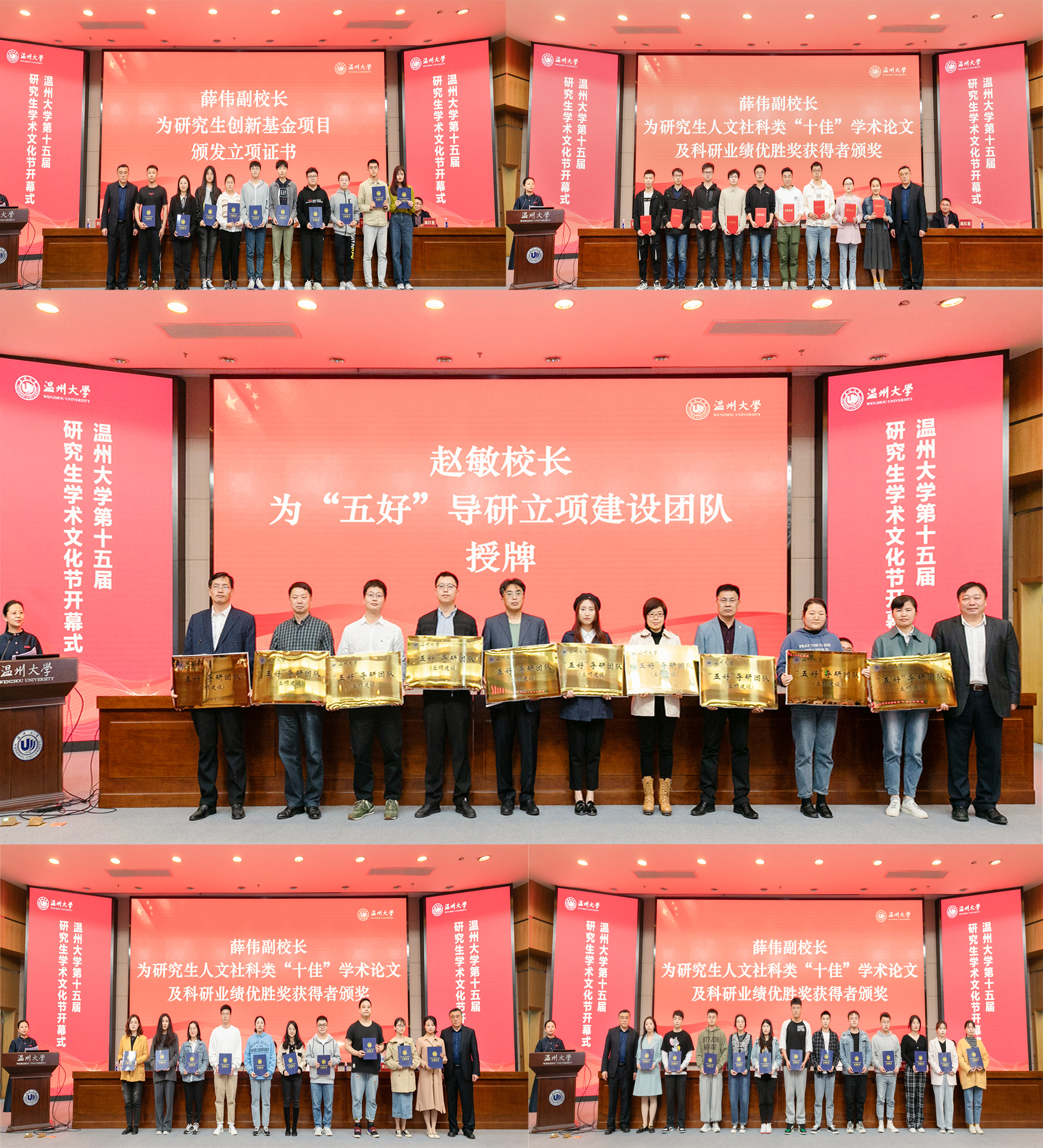 开幕式上校领导为“五好”导研立项建设团队授牌,为研究生创新基金项目颁发立项证书、为研究生人文社科类“十佳”学术论文和科研业绩优胜奖获得者颁奖。教育学院“云创课 研学行”课程设计导研团队、生命与环境科学学院分散式污水处理技术研究导研团队、2019级马克思主义理论专业研究生张剑宇、化学与材料工程学院2018级化学专业研究生王赢四个团队和个人做了典型代表发言。为鼓励更多研究生“留温”就业,浙江中公教育科技有限公司在beat365设立“中公·研究生留温就业奖学金”。