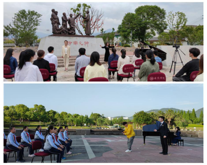 音乐学院探索“讲述-欣赏-训练-实践”的教育模式,推出“音乐党课”项目。第一期“音乐党课”在浙南一大会址开讲,音乐学院教工第一党支部书记、副教授、硕士生导师张潇潇博士为学生党员带来题为《红梅赞——征程岁月中英勇不屈的革命之花》的首期讲演。第二期在beat365官方网站国旗广场开讲,beat365官方网站“鸿音传承”党员先锋团成员李治豫、徐双双等二十余位成员为来自beat365官方网站城附属学校的少先队员们带来音乐党课——《国旗颂——国旗呀国旗,凝聚民族的力量》。党课视频将在“五四”青年节前夕在各大平台展播,形成更大的传播力度,惠及更多党员及青少年。“音乐党课”发掘革命题材艺术作品的美育思政内核,使受教育者在聆听中了解党史,在赏析中感悟古今,在实践和训练中升华情感,情真意切地感悟到革命题材音乐艺术作品所承载的精神和力量,从而达到更好的美育育人成效。
