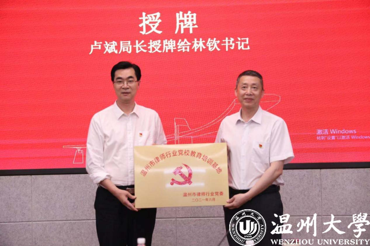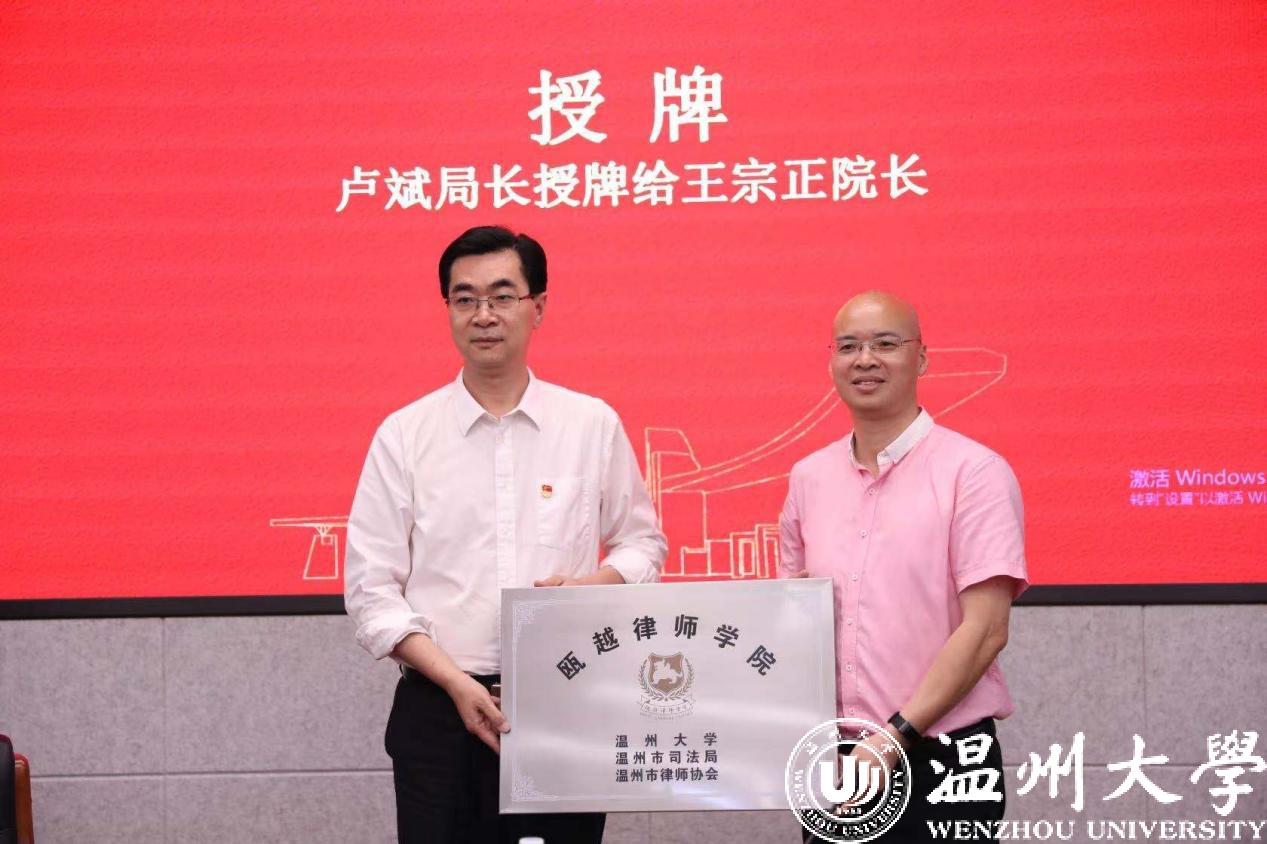 仪式上,林向光副局长、叶连友会长和周湖勇副院长分别代表温州市司法局、温州市律师协会、beat365官方网站签署了合作设立瓯越律师学院协议。卢斌局长向王宗正院长授瓯越律师学院牌匾、向林钦书记授温州市律师行业党校教育培训基地牌匾。