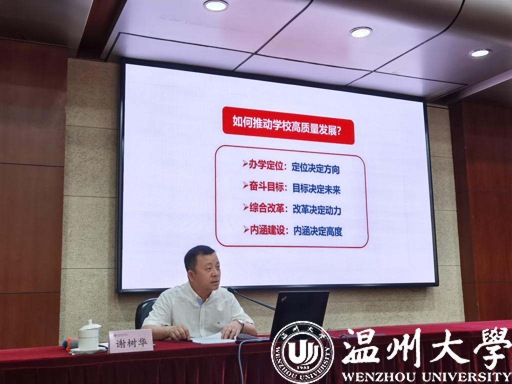 谢树华作《以现代化治理推动高质量发展——大学治理的探索与思考》的专题报告。谢树华指出,推动学校高质量发展,重点要关注四个问题。一要关注办学定位,定位决定方向。高校要根据办学基础、办学现状等因素,结合未来发展需要,确定自身在高等教育系统中的位置和跑道。二要关注奋斗目标,目标决定未来。学校的未来取决于设定的目标,以及为实现目标而付出的努力。高校要科学设定发展目标,发挥目标管理的指向、凝聚、整合、检验、激励等重要作用。三要关注综合改革,改革决定动力。要按照“结构决定功能、人事决定动能、制度决定效能”的理念,推动学校机构、人事、制度等方面的系统改革。改革要做到取舍有度,坚持好的,修正错的,创造新的。四要关注内涵建设,内涵决定高度。要坚持和加强党的全面领导,遵循教育的规律、遵循大学办学的规律,不断提高人才培养、学科建设、人才发展、干部队伍、社会服务等内涵建设,努力实现学校更高质量发展。