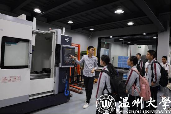 实验中心党支部党员正在给温州实验中学学生介绍数字化加工设备
