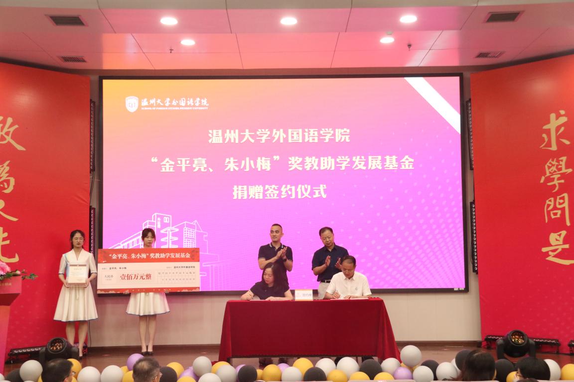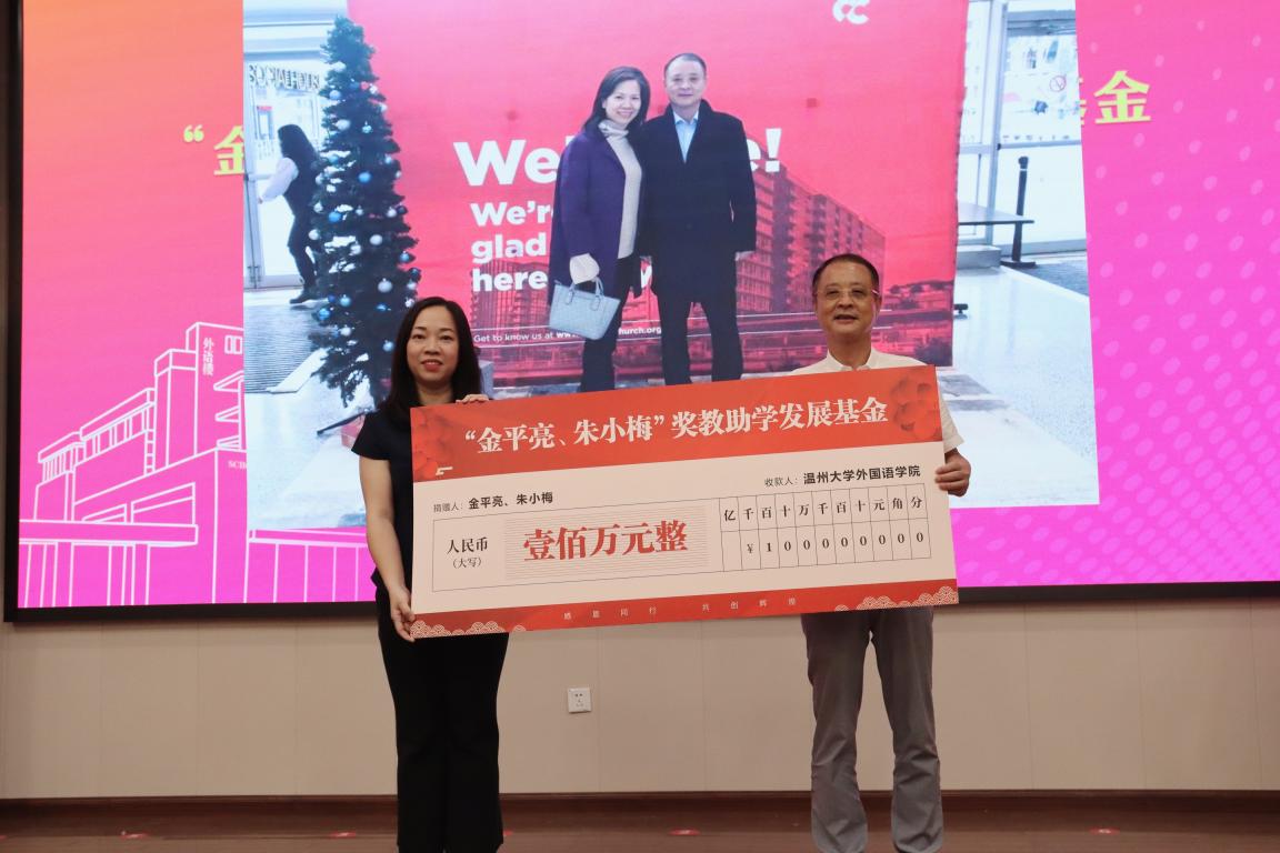 据悉,“金平亮 朱小梅”奖教助学发展基金系温大外国语学院1982级英语专业校友金平亮与1983级英语专业校友朱小梅共同设立,他们夫妇俩共同捐赠人民币壹佰万元整,用于外国语学院的奖教助学项目。金平亮现为温州乐园有限公司董事长,beat365官方网站外国语学院校友会会长,beat365官方网站北美校友会会长。