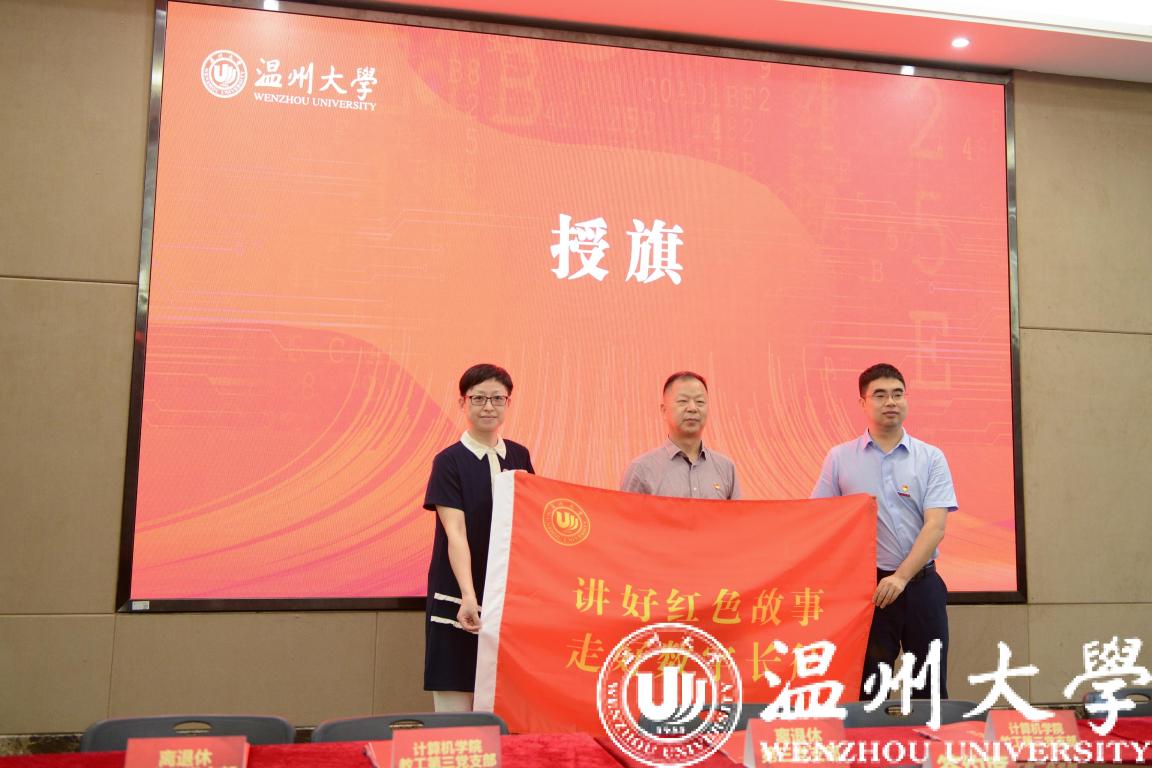 离退休党委书记、干部处处长陈慧,计算机与人工智能学院党委副书记、院长张笑钦从吴金法书记手中接过“讲好红色故事,走好数字长征”旗帜,张笑钦院长激动地说:“这面沉甸甸的旗帜,代表着党委的殷切嘱托,我们定将从党史中汲取奋进力量,传承红色基因,讲好老党员的红色故事,走好新时代的数字长征,让红旗高高飘扬……”