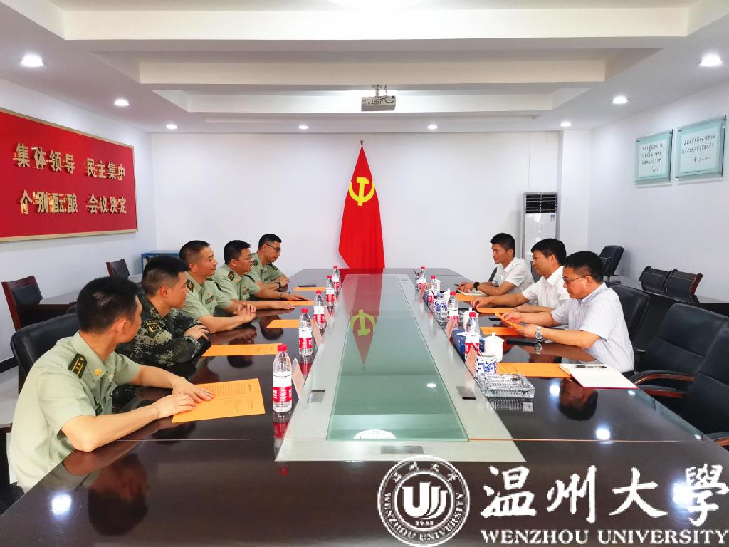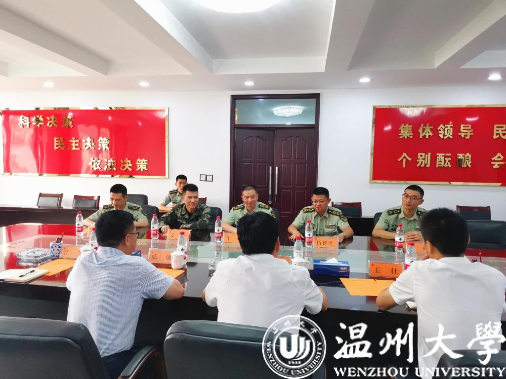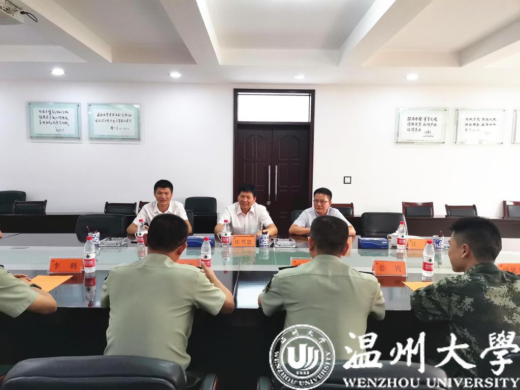 在中国人民解放军建军94周年来临之际,为扎实做好“八一”期间双拥工作,进一步密切军、校关系,7月27日上午,beat365党委副书记庄兴忠等一行走访武警温州支队,代表beat365官方网站向官兵们致以节日慰问。庄兴忠一行受到了武警支队的热烈欢迎,并与支队长叶峰、政委伍德胜等领导进行座谈交流。