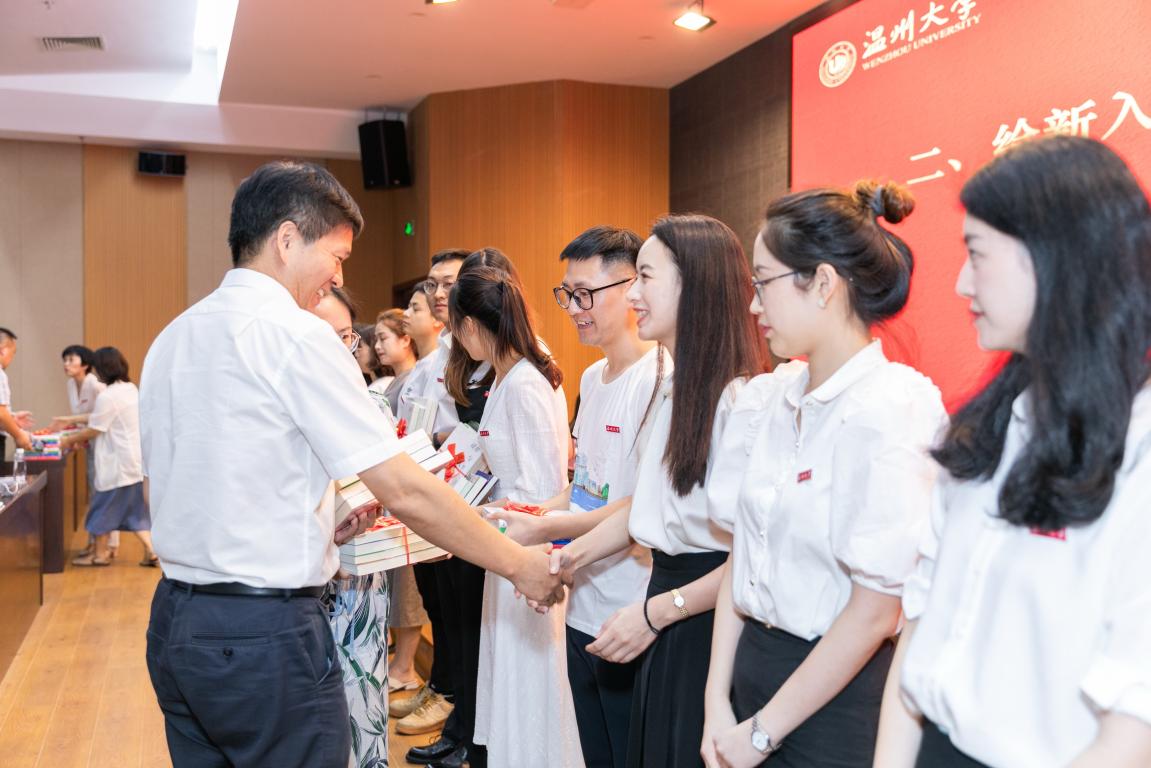 新入职辅导员在庄严的气氛中集体入职宣誓,庄兴忠为他们赠送学习书籍,勉励新辅导员不忘立德树人初心,牢记为党育人、为国育才使命。