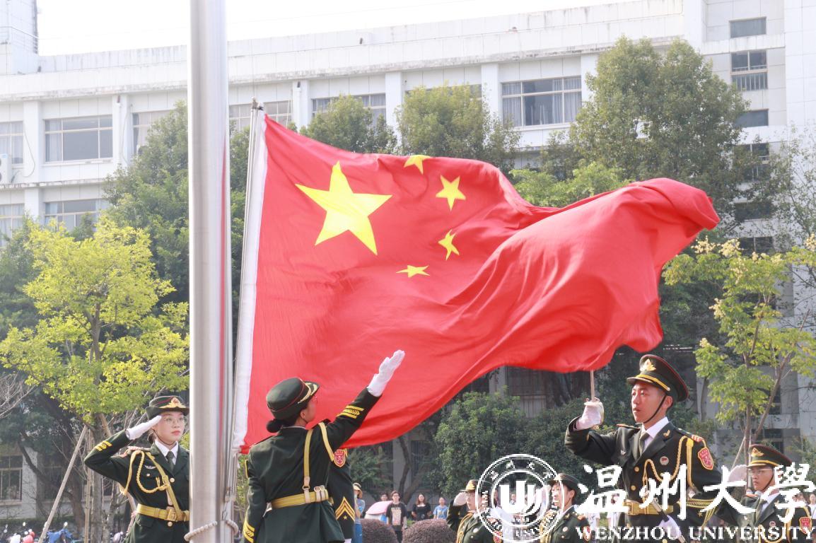 伴随着雄壮的《义勇军进行曲》响彻温大校园,鲜艳的五星红旗冉冉升起,现场师生向国旗致以庄严的注目礼,深情表达对伟大祖国的热爱。