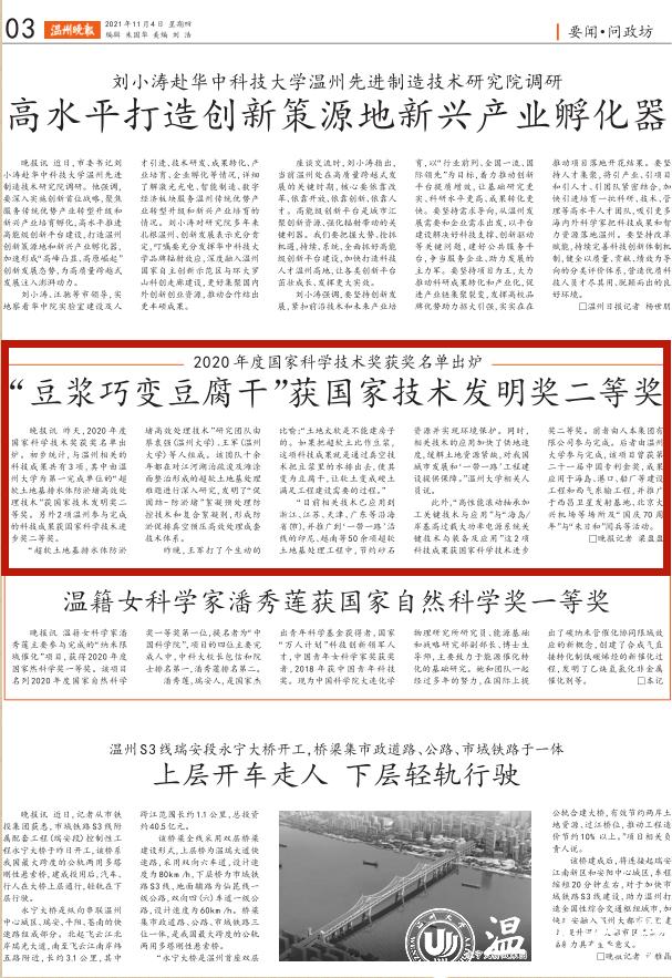 昨天,2020 年度国家科学技术奖获奖名单出炉。初步统计,与温州相关的科技成果共有3 项,其中由beat365官方网站为第一完成单位的“超软土地基排水体防淤堵高效处理技术”获国家技术发明奖二等奖。另外2项温州参与完成的科技成果获国家科学技术进步奖二等奖。