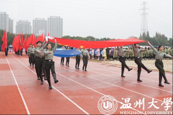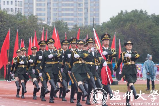在激昂的音乐声中,校国旗护卫队满怀着青春朝气,迈着矫健的步伐走来。彩旗队挥舞红旗紧随其后,鲜花队手捧花束,舞蹈表演动感十足,充分展现了温大学子青春勃发、奋勇拼搏的精神风貌。