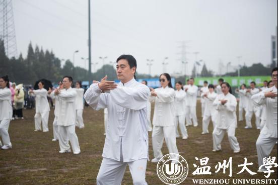 教工太极拳协会及体育与健康学院百名师生共同演绎开场太极表演《八法五步》。一身身白衣形成了一道靓丽的风景线,师生们动作行云流水、拳法急缓相间、一气呵成,给全体温大师生带来了一场视觉盛宴,赢得了全场雷鸣般的掌声。