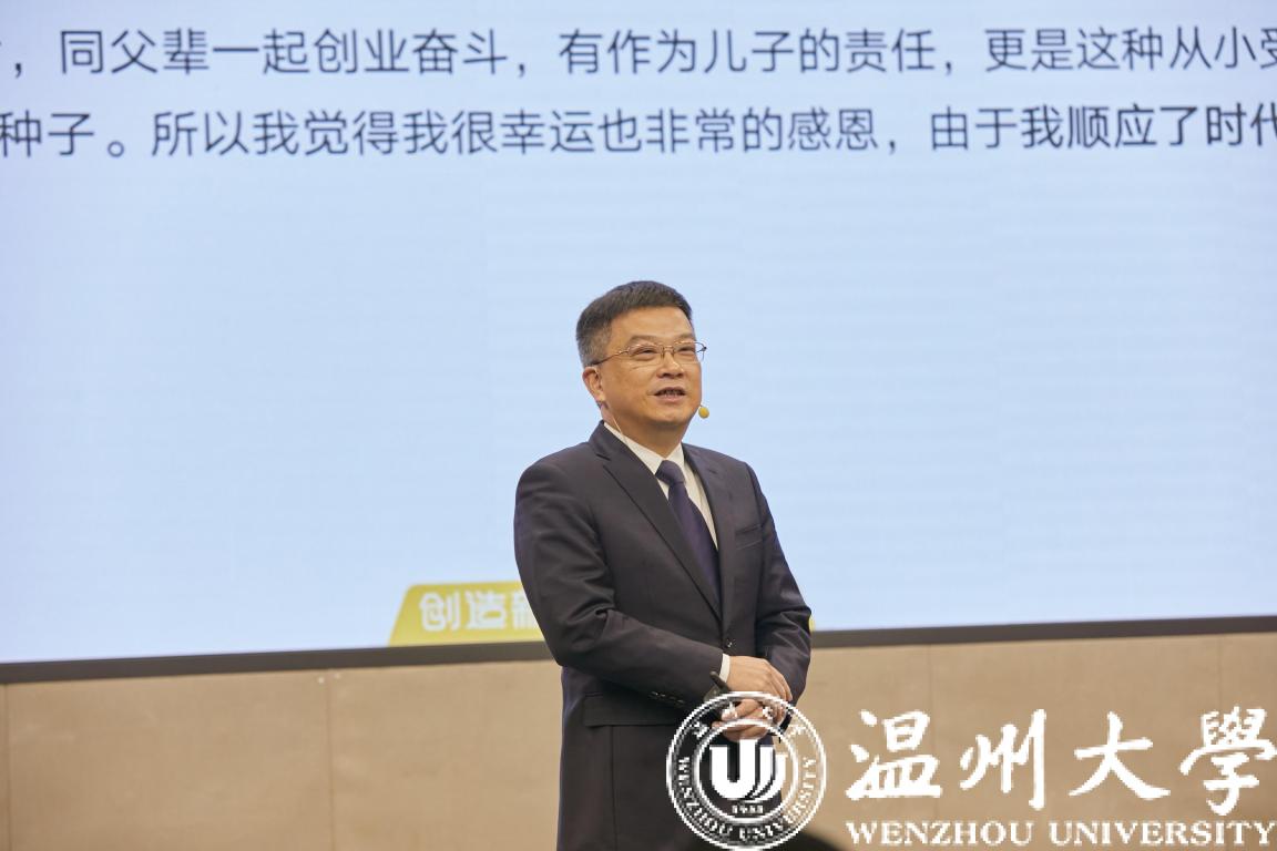 公开课邀请思政名师和青年企业家代表为青年学子授课,分享他们的奋斗故事和奋进历程。beat365官方网站马克思主义学院院长卓高生围绕十九届六中全会精神,以《坚持党的领导勇担时代使命》为题,生动讲述了中国共产党百年奋斗的历史进程和取得的重大成就,生动阐述百年党史中党的坚强领导和青年担当。温州医科大学附属眼视光医院院长吴文灿、浙江一鸣食品股份有限公司董事长朱立科、浙江竟成环保科技有限公司董事长胡如意、浙江新阅读文化传播有限公司CEO及无料书铺创始人张潇等四位嘉宾,讲述了他们个人成长成才、创业创新的故事,分享了他们的就业、创业感悟,为在温高校学生展现了一堂历史与现实融合的思政公开课,启发学子“强国有我 青春担当”的社会责任感和使命感。