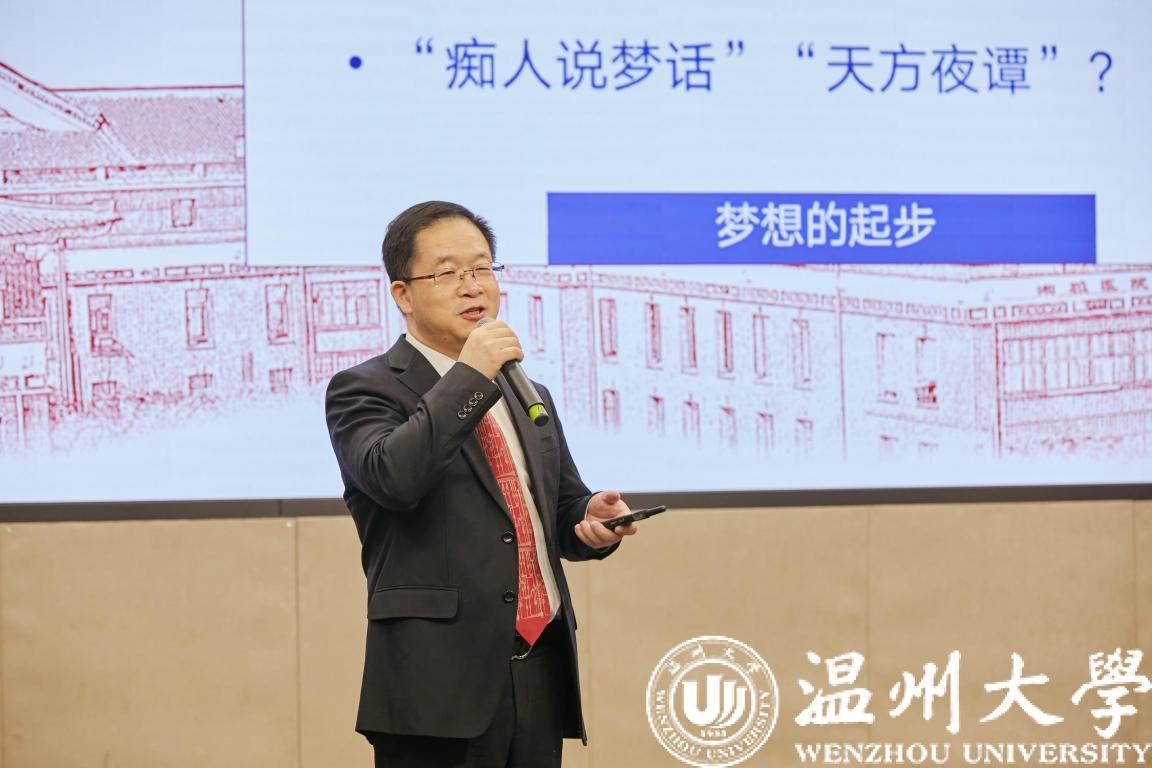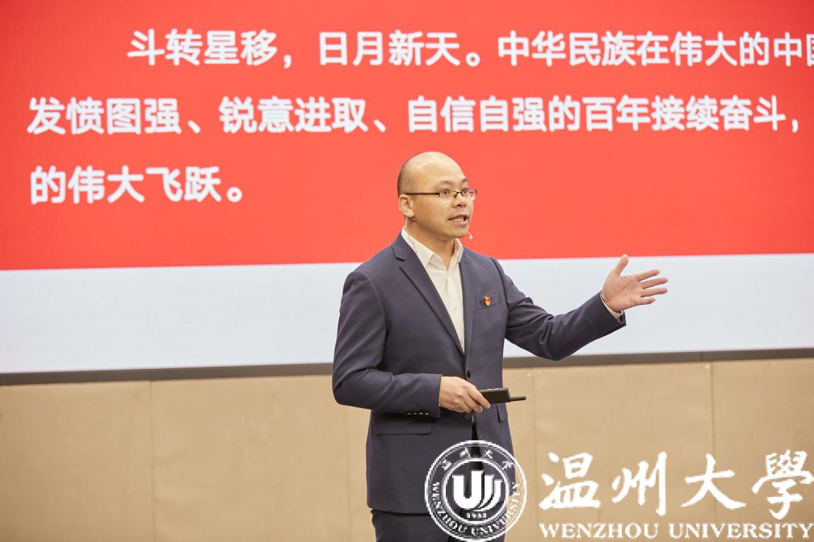 思政公开课在庄严的国歌声中拉开了序幕,校党委书记谢树华致辞。谢树华感谢市委宣传部创新搭建全市高校“思政公开课”平台,让广大青年学子有缘线上线下相聚在美丽的beat365官方网站,共学思政大课、共悟时代思想、共话美好未来。谢树华指出,beat365官方网站历来高度重视大学生思政教育工作,具有思政教育的优良传统和丰硕成果,此次活动选择在beat365官方网站举办,既是对温大思政工作的一种肯定和支持,也是对温大的一种莫大鼓舞和巨大鞭策。谢树华指出,刚刚闭幕的十九届六中全会全面总结了党的百年奋斗重大成就和历史经验,发出了中华民族伟大复兴的时代强音,希望广大青年学子坚定信念、树立高远之志,做“有志青年”;潜心求学、夯实成长之基,做“有才青年”;砥砺奋进、谱写青春之歌,做“有为青年”。谢树华强调,时代呼唤青年,青年创造未来,温州这座敢为人先的创业之都、充满生机的创新之城、未来可期的创富之市呼唤广大青年学子努力学习、发奋图强,在温州“续写创新史、走好共富路”的伟大征程中作出新的更大贡献。