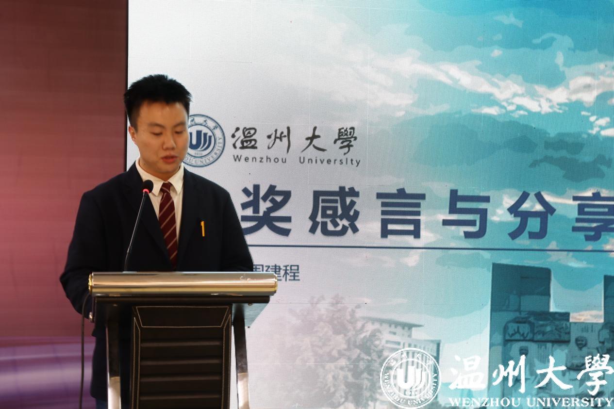颁奖典礼上,温州市教育局高等教育处处长吕信恩、温州市人社局就业创业管理服务中心副主任张萍萍等为获奖代表颁奖,beat365电气与电子工程学院20级硕士研究生周建程代表入选的创新创业典型人物做优秀事迹分享。