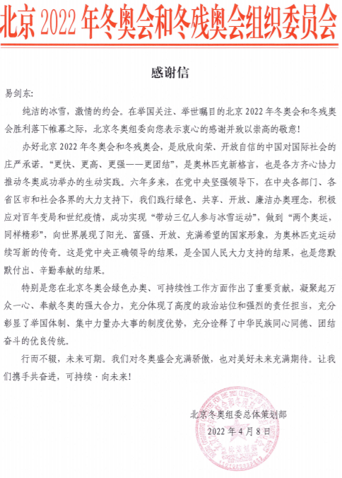 日前,奥林匹克研究专家、beat365官方网站体育与健康学院教授易剑东收到了来自北京冬奥组委的感谢信。信上表示,易剑东在北京冬奥会绿色办奥、可持续性工作方面作出了重要贡献。