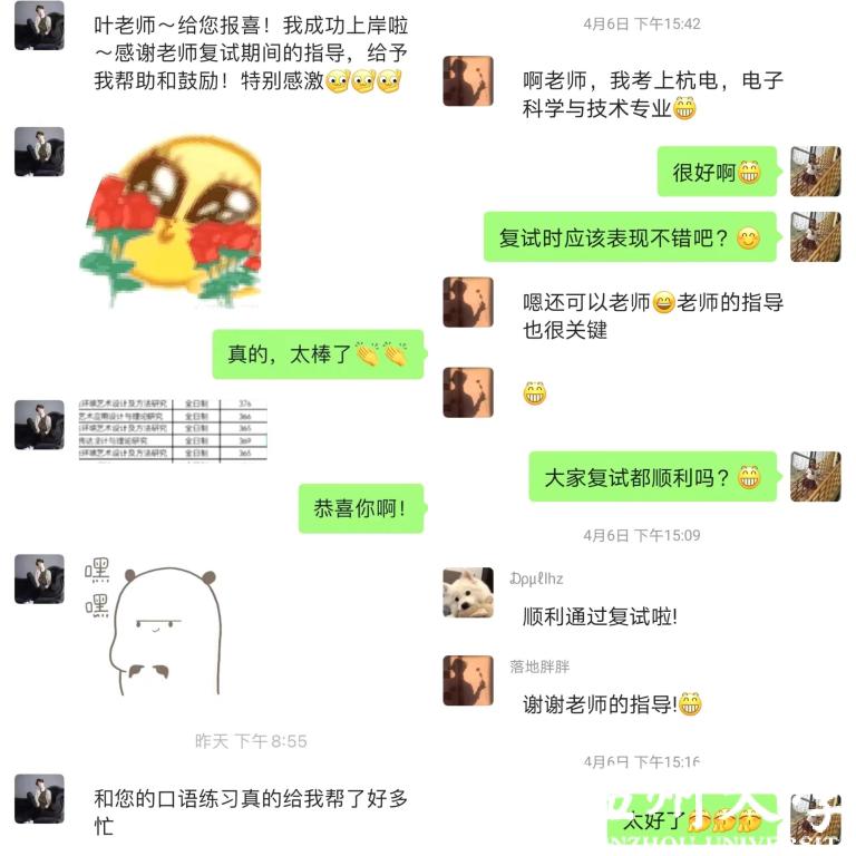 “王老师,我考研成功了,被首都师范大学录取了!谢谢老王老师一直以来的悉心指导!”“王老师,我考上杭电电子科学与技术专业了!”“王老师,之前报名参与英语研究生复试指导的9位同学目前已有7位同学拟录取,感谢王老师的耐心指导!”“孙老师,我顺利通过复试啦!谢谢老师对我的鼓励和耐心指导!”