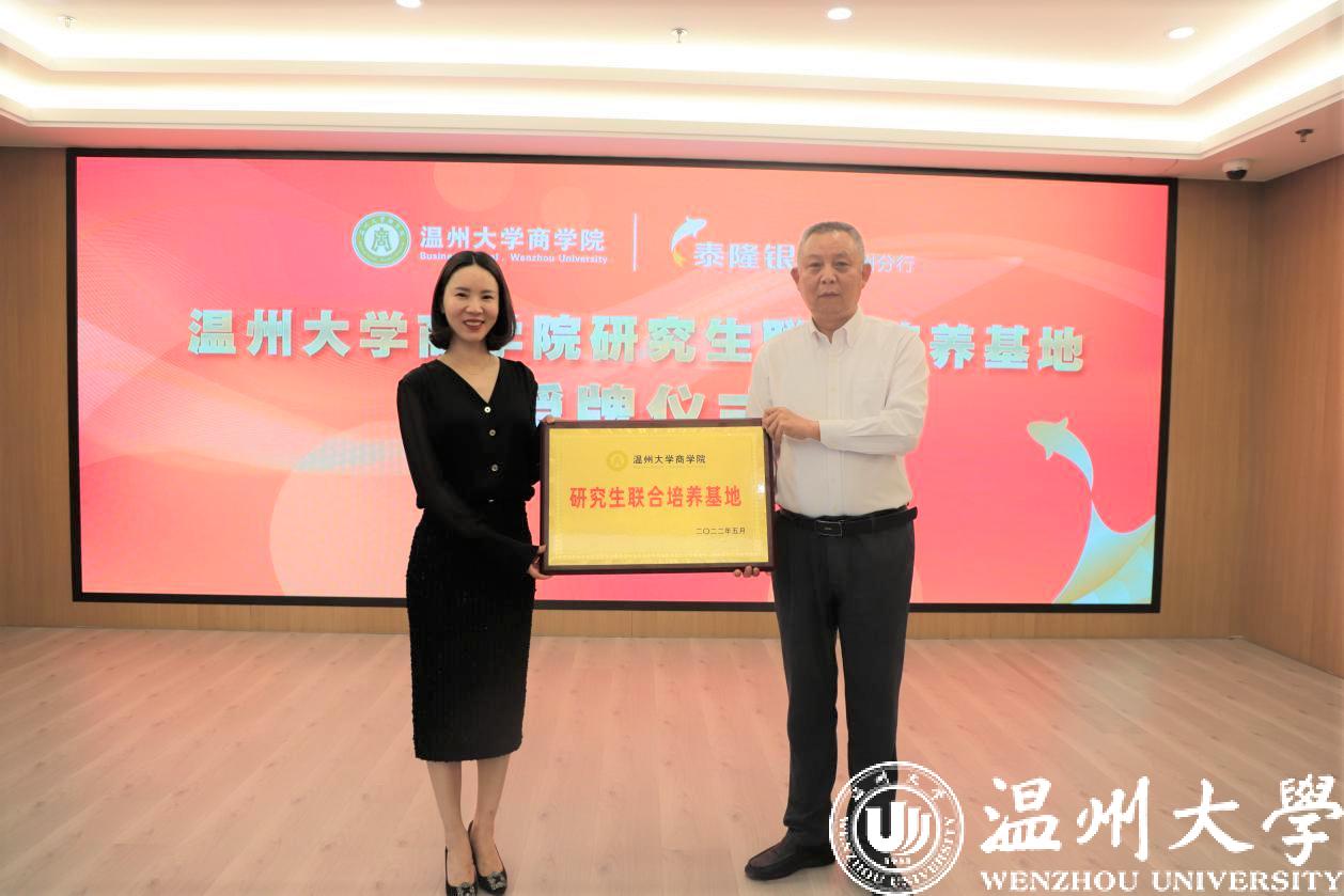 随后,双方领导及出席嘉宾就此次活动签订了“银校共建”党建合作协议,并举行了泰隆银行温州分行就业实习基地、研究生联合培养基地的授牌仪式。