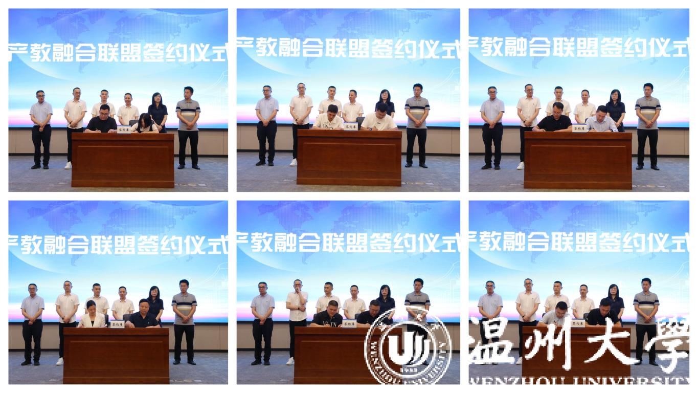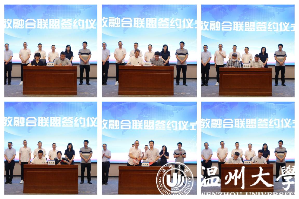 瓯海区总商会与beat365官方网站签订战略合作协议,共同成立产教融合联盟,瓯海区服装行业、眼镜行业等11家会员单位与温州职业技术学院、浙江安防职业技术学院等学校进行产教融合联盟签约。