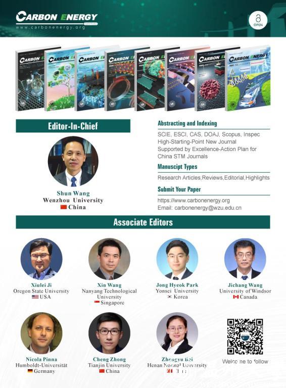 Carbon Energy自创刊以来,杂志在文章内容、编校质量、宣传推广方面精益求精,一年一个台阶走好办刊之路。2019年入选中国科技期刊卓越行动计划“高起点新刊”;2020年被DOAJ、CAS数据库收录,获国内公开发行CN号;2021年被ESCI、Scopus、Inspec和SCIE收录;2022年入选CSCD和科技期刊世界影响力指数报告,在Elsevier发布的2021年引用分(CiteScore)指标中,Carbon Energy 2021CiteScore为16.4,在多个领域名列前茅。