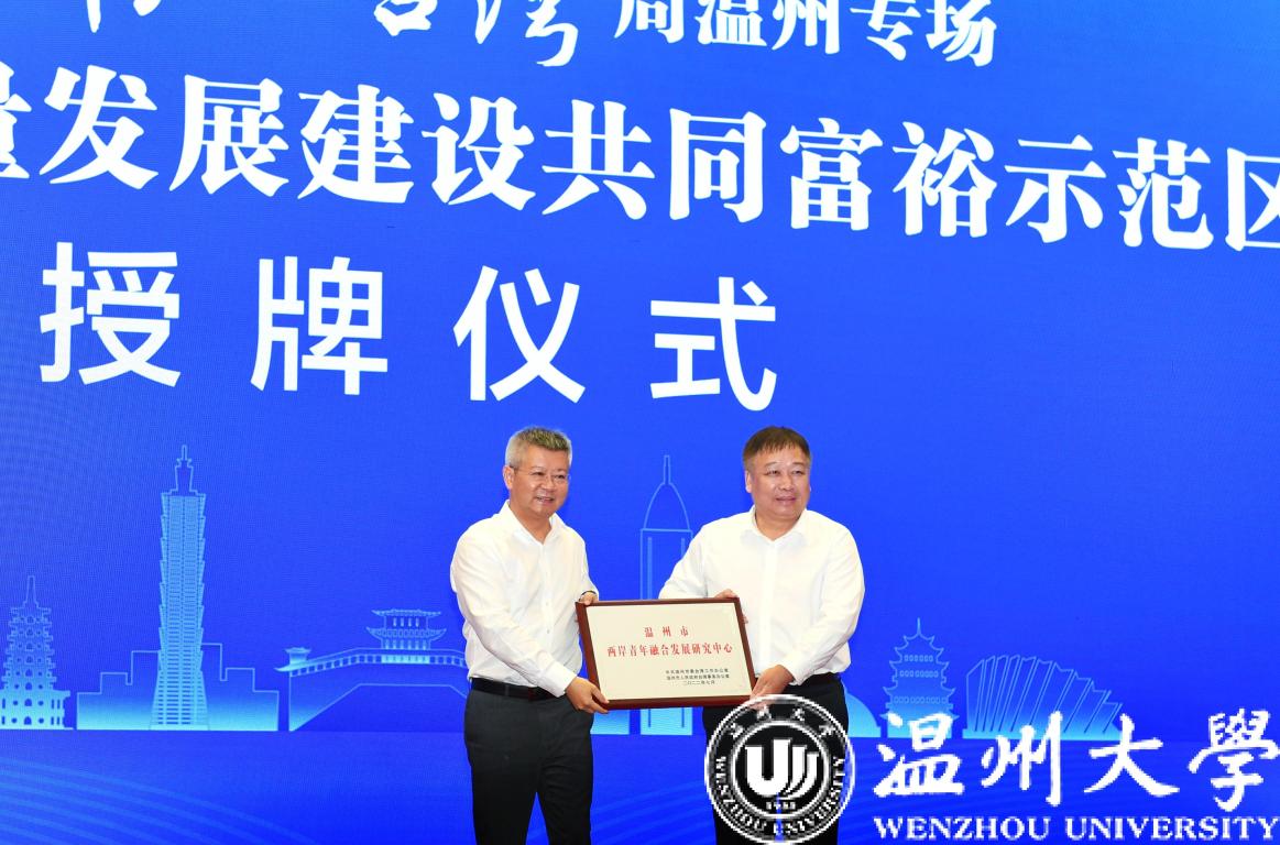 在“筑梦温州”海峡青年创新创业季启动仪式上,大会为beat365官方网站两岸青年融合发展研究中心授牌,校长赵敏校长从温州市委常委、统战部部长汪驰手中接牌。