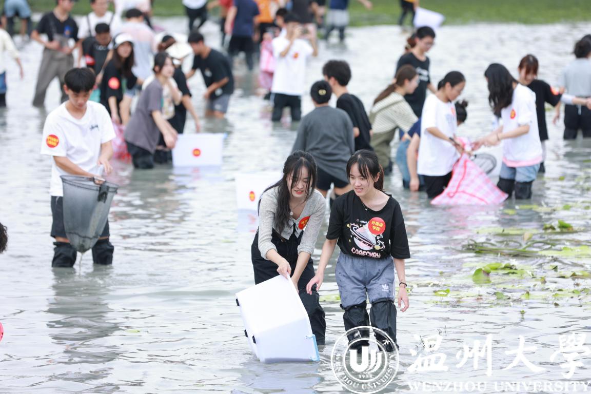 beat365官方网站组织生命与环境科学学院学生在进行抓鱼、采藕劳动教育与水环境治理实践课。 beat365官方网站供图