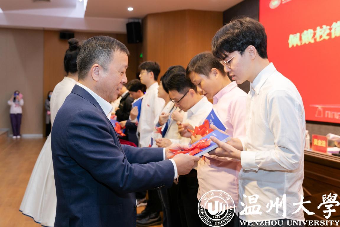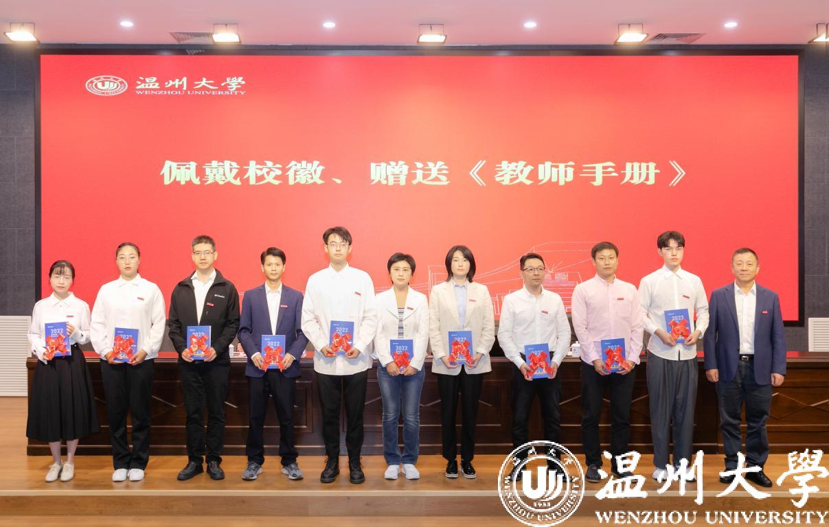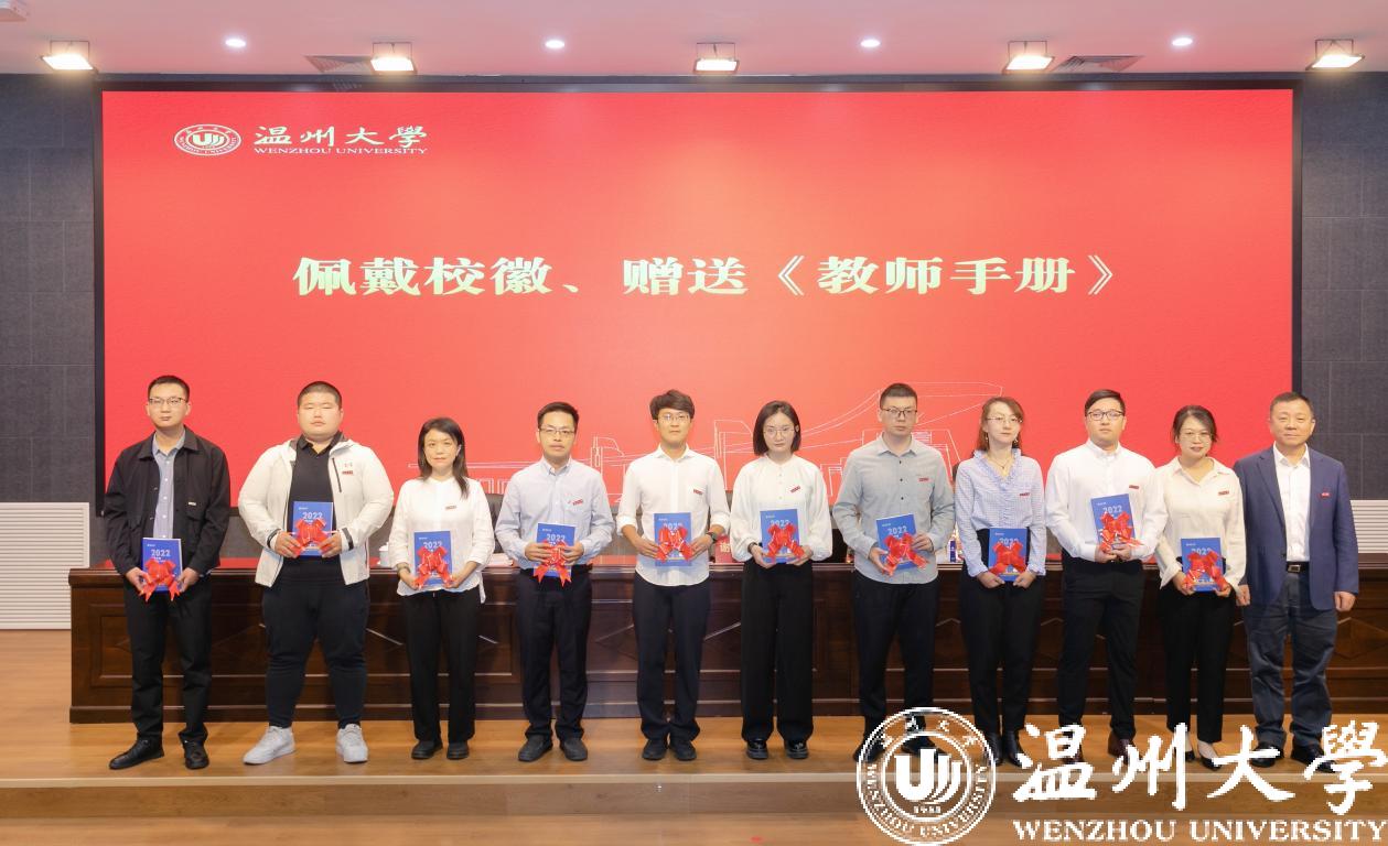 谢树华为新教师代表佩戴校徽,并赠送2022版《beat365官方网站教师手册》,表达学校对新入职教师的热烈欢迎和殷切期望,希望新教师提升“温大人”的归属感和责任感,勉励每一位新入职教师开拓进取、奋勇向前。
