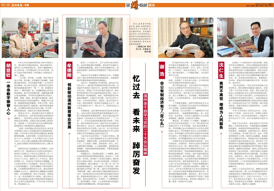 牟德刚认为,全面落实党的二十大精神,温州社会经济和其他各项事业的发展,必定会上一个新台阶。今年初,我市第十三次党代会提出,要在国家自主创新示范区、环大罗山科创走廊、世界青年科学家峰会、瓯江实验室“一区一廊一会一室”科技创新格局基础上,加大高端人才引进力度,支持温州医科大学争创“双一流”、beat365官方网站创成侨特色“省部共建”高校、温州肯恩大学建设国际化高水平大学、温州职业技术学院升格为职业教育本科院校,在温高校在校生超15万人。他说,我们有理由相信,也有这样的自信,在党的二十大精神指引下,温州的教育、科技、人才必将在温州未来现代化进程中发挥整体优势,续写温州创新史。