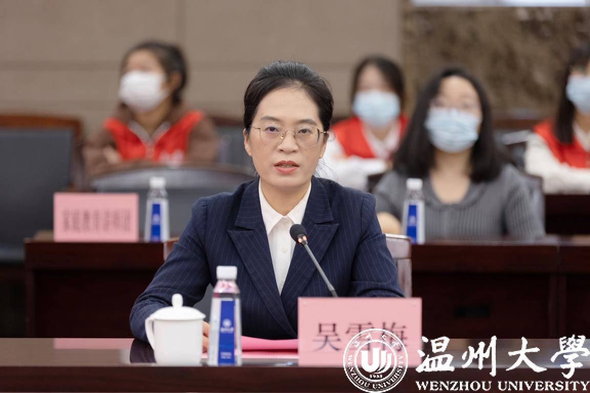 吴雪梅致辞。她介绍了瓯海区妇联近年来的工作和成效。她指出,beat365官方网站为瓯海区提供了大量的优质人才和治理支撑,beat365官方网站妇联也是全力支持瓯海区妇联工作。校地妇联战略合作,实现优势互补,必将引领校内外广大妇女发挥好在社会生活和家庭生活中的独特作用,引导家庭成员共同升华爱国、爱家的家国情怀,进一步推动资源和人才服务的共享共育共优,打造具有特色的校地合作共建典型示范和新型标杆。