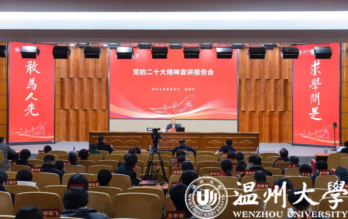 谢树华强调,深刻领悟贯彻党的二十大重要精神和核心要义,对于我们不断谱写新时代中国特色社会主义新篇章、奋力实现中华民族伟大复兴的中国梦有着重要指导作用和现实意义。一要深刻领悟大会主题统摄全局的重大战略考量。大会主题系统集成“国之大者”,统摄战略全局,既是大会的灵魂,也是党和国家事业发展的总纲,是深入学习贯彻党的二十大精神的关键。二要深刻领悟新时代十年伟大变革的重大里程碑意义。新时代十年伟大变革,从理论上讲是原创性、突破性、开创性的;从制度上讲是创新性、整体性、系统性的;从实践上讲是根本性、战略性、长远性的。三要深刻领悟马克思主义中国化时代化新的飞跃的重大理论创新。党的二十大报告深入总结我们党坚持和发展马克思主义的历史经验,系统阐述“两个结合”的要求,精辟概括习近平新时代中国特色社会主义思想贯穿的立场观点方法,号召全党继续推进实践基础上的理论创新,不断开辟马克思主义中国化时代化新境界。四要深刻领悟以中国式现代化全面推进中华民族伟大复兴的重大历史使命。中国式现代化是人口规模巨大的现代化、全体人民共同富裕的现代化、物质文明和精神文明相协调的现代化、人与自然和谐共生的现代化、走和平发展道路的现代化。五要深刻领悟推进社会主义现代化国家建设的重大系统部署。特别是高质量发展已经成为首要任务、教育科技人才“三位一体”的地位更加突显、侨务事业肩负着重要的时代使命、全面依法治国是国家治理的深刻革命等方面,与学校发展密切相关。六要深刻领悟坚持党的全面领导和全面从严治党的重大任务要求。必须坚持党中央集中统一领导,必须把“两个确立”作为最高政治原则,必须坚持党的自我革命永远在路上。