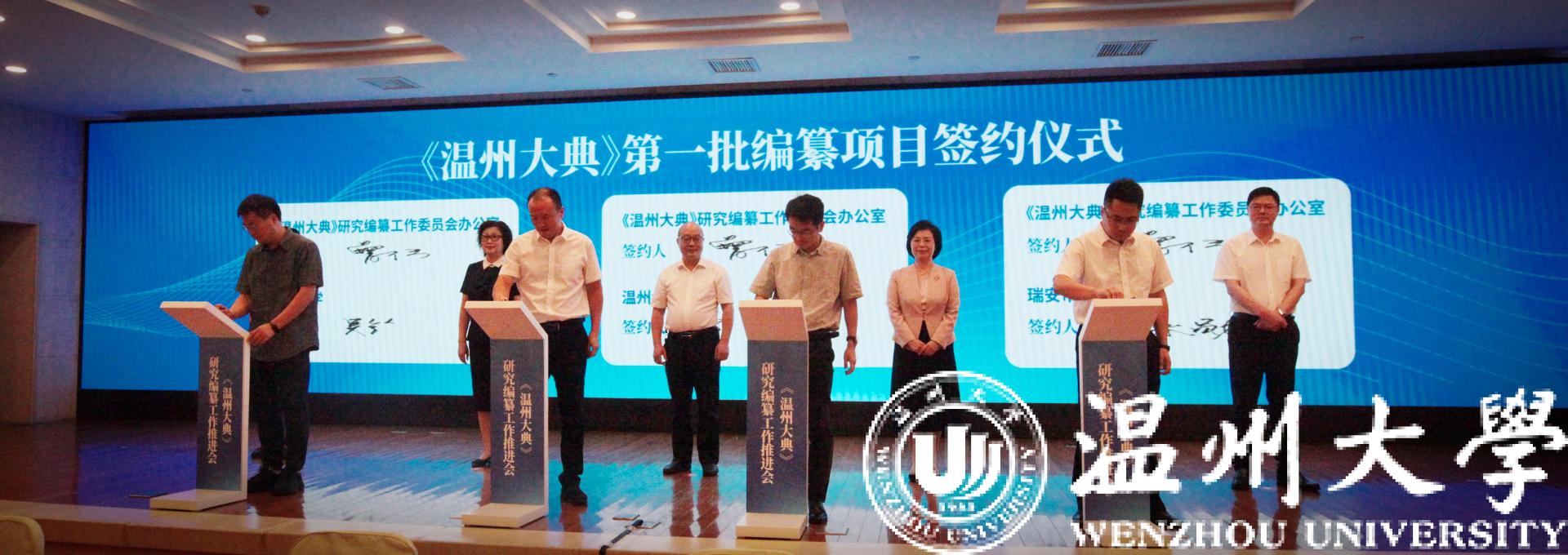 9月8日,温州召开《温州大典》研究编纂工作推进会。会上成立了《温州大典》学术委员会,聘任了首批31位学术委员会主任、顾问、委员。人文学院负责人代表beat365官方网站签署《温州大典》第一批编纂研究项目,标志着《温州大典》编纂工作迈向实质性阶段。《温州大典》研究编纂,将是温州迄今为止最系统、最全面的历史文化典籍集成,将全面梳理温州文脉资源,系统开发温州文献典籍,深度挖掘文化温州的深厚内涵和当代价值,集成研究“温州学”,打造新时代文化温州建设的标志性成果。