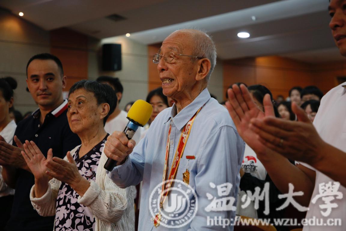 师生共聚,见证祖国繁荣富强。学校离休老教师代表杨作浩老师也一同观看了直播。杨作浩老师今年已经九十六岁高龄,但他仍旧坚持在这一天,在温大,为祖国祝福。他为大家演唱了一首《毕业歌》,“同学们!同学们!快拿出力量,担负起天下的兴亡!”沧桑而有力量的歌声传来,在场师生无不动容。这不仅仅是一首歌,更是一个经历过中国几十年风云变幻的老人对一代年轻人的叮嘱和鼓舞。