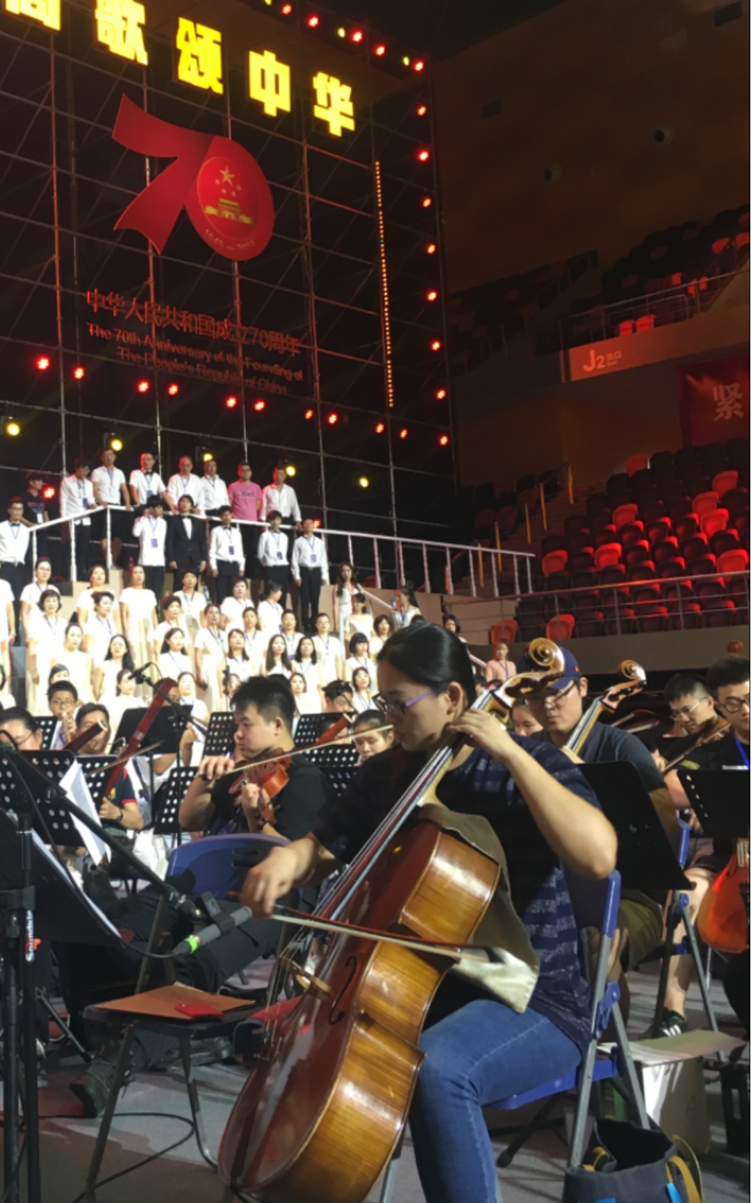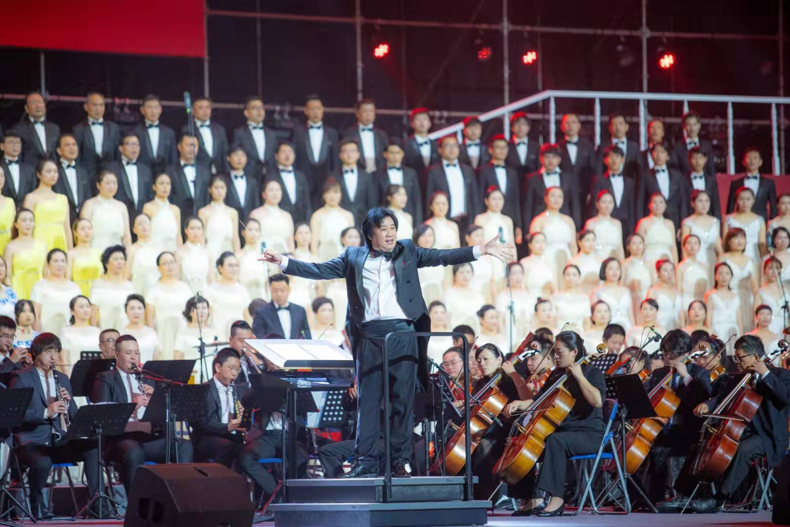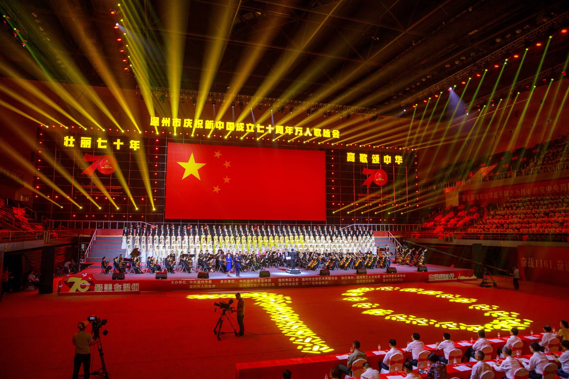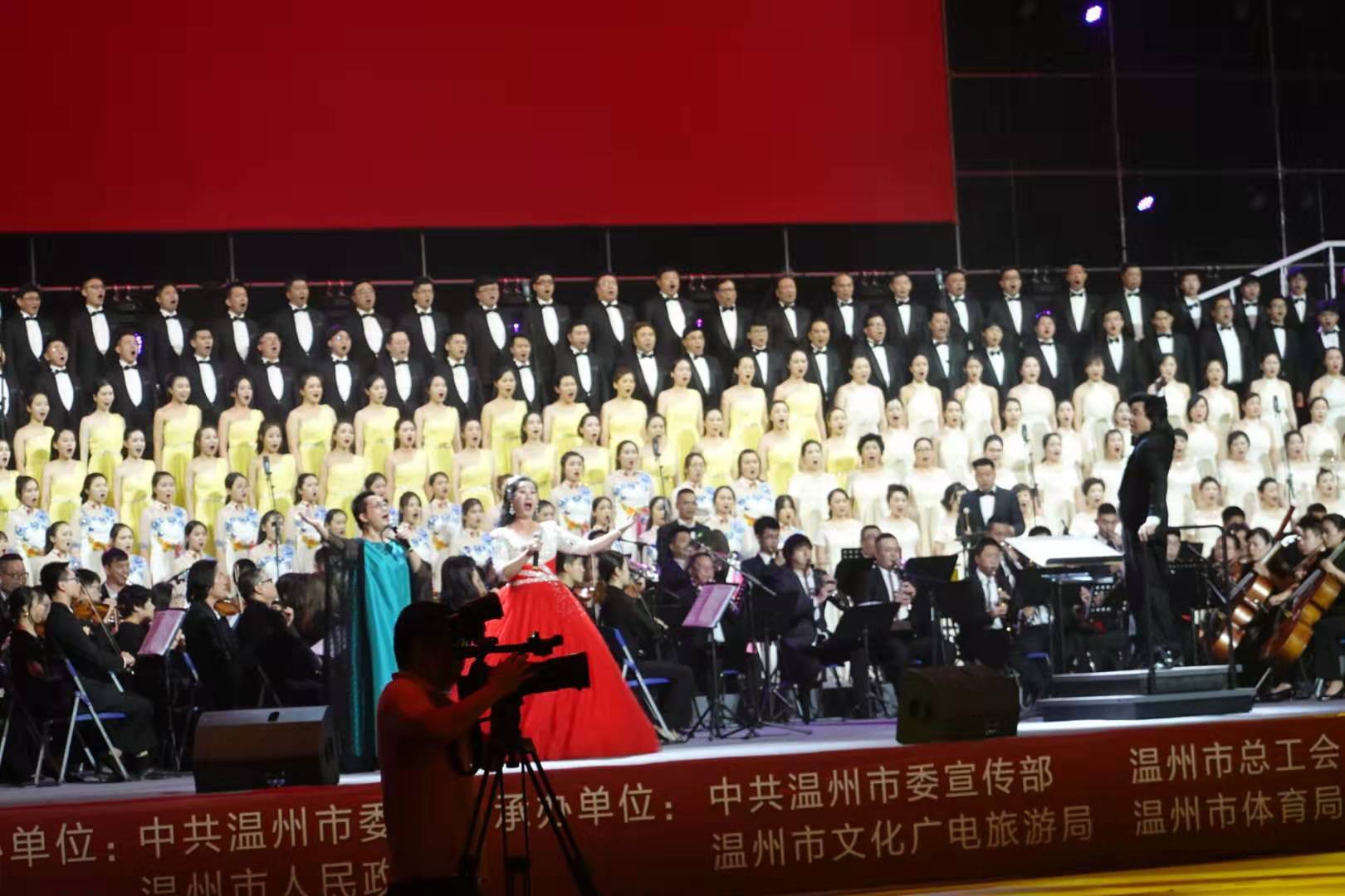 9月26日晚,温州市奥体中心体育馆歌潮涌动。“壮丽七十年、高歌颂中华——温州市庆祝新中国成立70周年万人歌咏会”在这里恢宏唱响。由温州名家艺术团、beat365官方网站室内乐团、温州市青少年交响乐团组成的温州市市民交响乐团的130名成员,和来自温州市合唱团、鹿城区女教师合唱团、温大学生合唱团、瑞安市合唱团的310位演员在主舞台精彩亮相。环形看台上,形成黄、白、粉、绿、军绿等18个彩色方阵,人们手中挥舞着红旗,脸上笑容洋溢。一个半小时里,22首满载爱国激情、抒发幸福情感的经典歌曲,经重新编排配器精彩呈现,彰显出瓯越大地歌颂祖国、歌唱家乡的热血情怀。