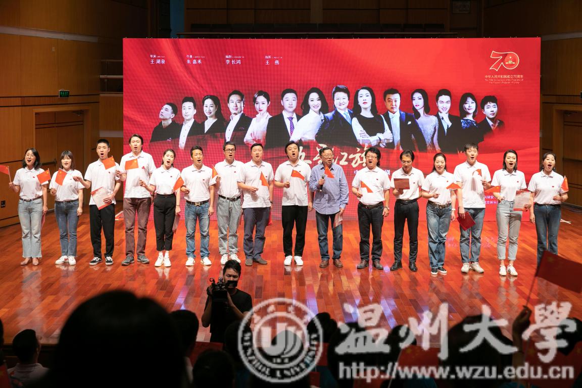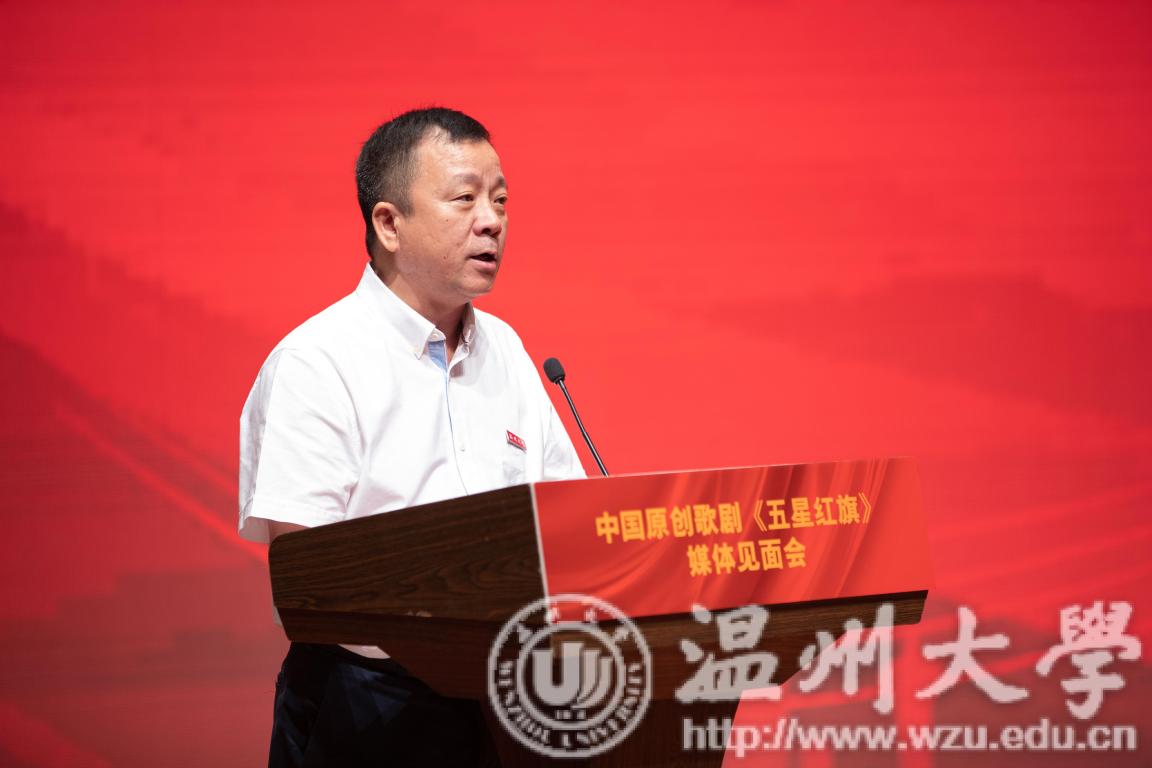 校党委书记谢树华讲话,他对温州市委宣传部的高度重视、精心指导,对瑞安市委的大力支持和业界优秀编剧、作曲、导演、指挥倾情加盟以及全体演职人员的辛勤付出表示感谢。他指出,歌剧《五星红旗》以中华人民共和国国旗设计者、beat365官方网站校友——曾联松的事迹为蓝本,在beat365官方网站创作并在全市公演,学校师生深感自豪,音乐学院师生担当歌剧大部分演职任务,这是对学校文化底蕴与学术积淀、音乐与舞蹈学科建设成就的一次检验和展示,对锻炼和培养学校优秀的艺术人才、对服务和推动地方文化繁荣都具有重要的意义。该作品的上演将对宣传和普及歌剧艺术起到良好的示范作用,对弘扬爱国精神、传播高雅艺术、培养优秀表演人才起到重要的推动作用,必将为进一步坚定文化自信,为繁荣文化事业作出积极贡献。作品能进一步激发温大人的干事创业激情,为实现学校发展目标和服务温州地方发展凝聚人心,献出温大智慧,作出温大贡献。