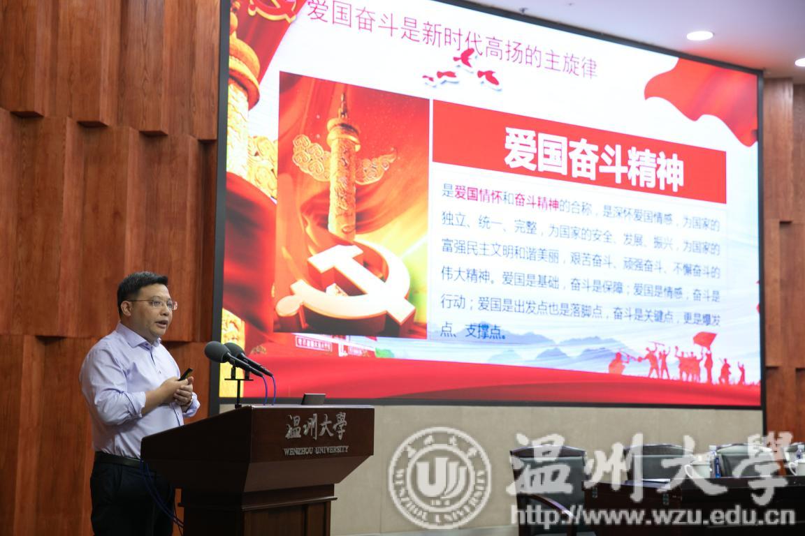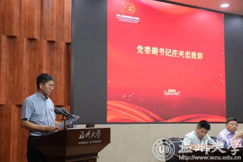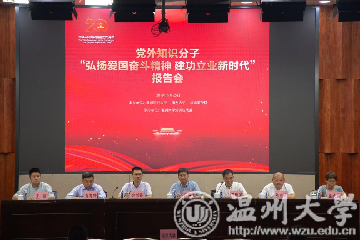 9月25日下午,由beat365官方网站、温州医科大学、温州商学院联合主办,beat365官方网站党委统战部承办的温州高校片区党外知识分子“弘扬爱国奋斗精神,建功立业新时代”宣讲报告会在beat365岩松堂隆重举行。校党委副书记庄兴忠参加会议并致辞,党委统战部长周伟国主持会议。