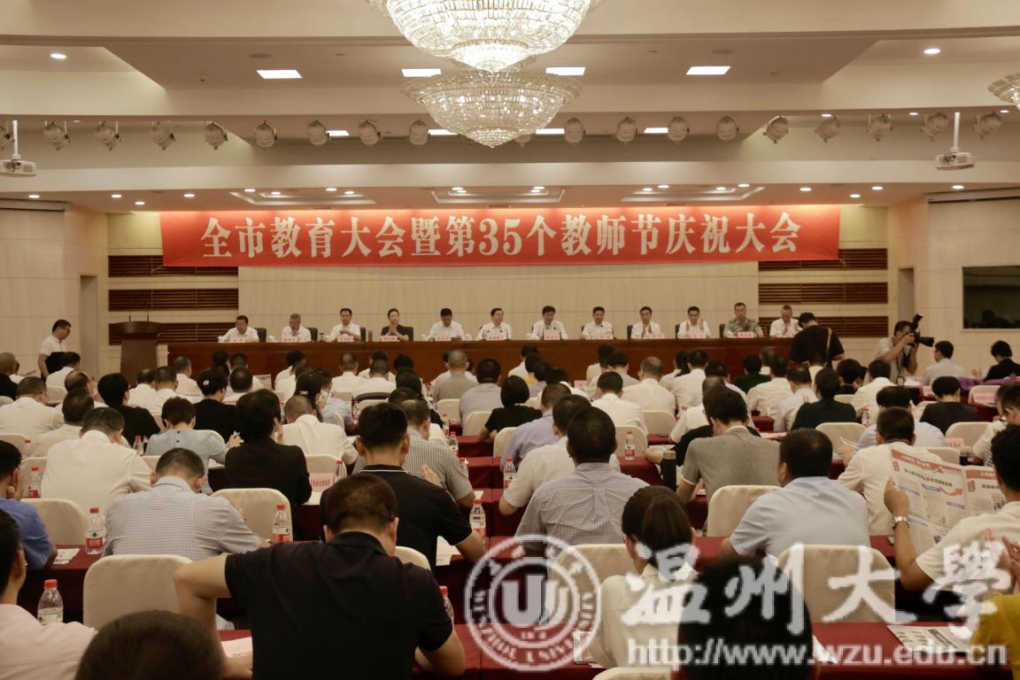 9月10日下午,温州市委市政府召开全市教育大会暨第35个教师节庆祝大会上。省委常委、市委书记陈伟俊,市委副书记、市长姚高员等市四套班子领导与全市广大教师和教育工作者等参加了此次大会。大家欢聚一堂,共庆第35个教师节,共商尊师重教的百年大计。beat365党委书记谢树华、校长赵敏参加了此次大会。