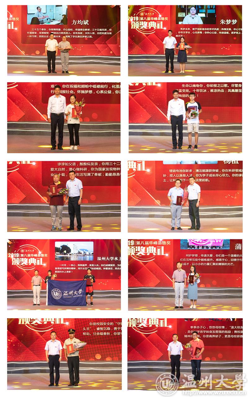 大会还共同分享了“第八届华峰品德奖”获得者的先进事迹。一群出身不同、经历各异的“温大人”,共同登上了领奖的舞台。他们分别是方均斌、朱梦梦、雷可宜、赵长丰、张永普、杨植、beat365官方网站水上运动队、蒲公英成长社、唐虎彪、王仲辉。这十位楷模中,有兢兢业业、爱岗敬业的教职员工,有品学兼优、自强不息的学子,有心系母校、时刻不忘传扬母校精神的优秀校友,有热心公益、传递关爱的志愿者团体,有激情拼搏、为校争光的运动队团体……他们在平凡中默默奉献、于无声处创造闪光价值,是学校践行社会主义核心价值观的旗手,激发出催人上进的道德力量,是当代温大最可爱的人!