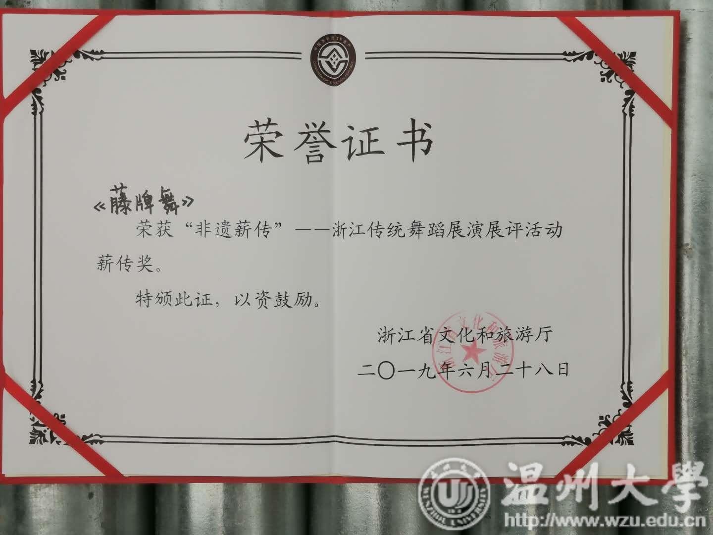 6月26—28日,浙江省“非遗薪传”舞蹈专场竞演活动在丽水景宁畲族自治县进行,由beat365体育学院和团委共建的藤牌舞俱乐部由周义义副教授带队参加此次比赛,获得了团体最高分和大会最高奖项“非遗薪传奖”。