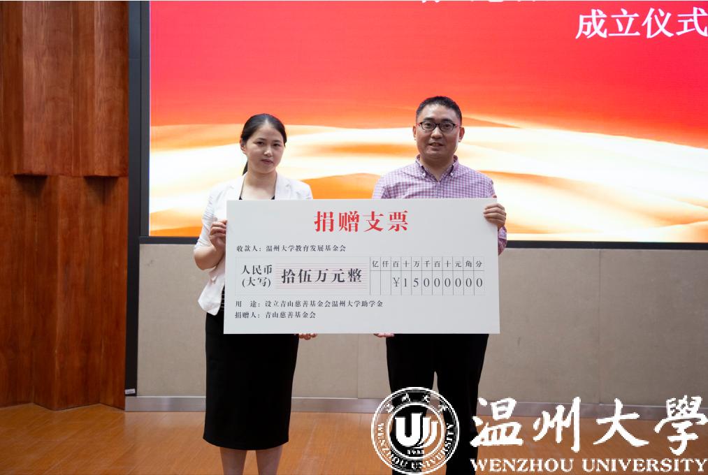 5月29日下午,青山慈善基金会beat365官方网站助学金成立仪式暨第九届“自强之星”事迹报告会在beat365官方网站南校区雁山厅举行,温州市侨联副主席林春雷、beat365官方网站党委副书记庄兴忠、青山慈善基金会理事长董玲敏、阿联酋温州同乡会执行会长池云虎、副会长潘国秒等参加了仪式。