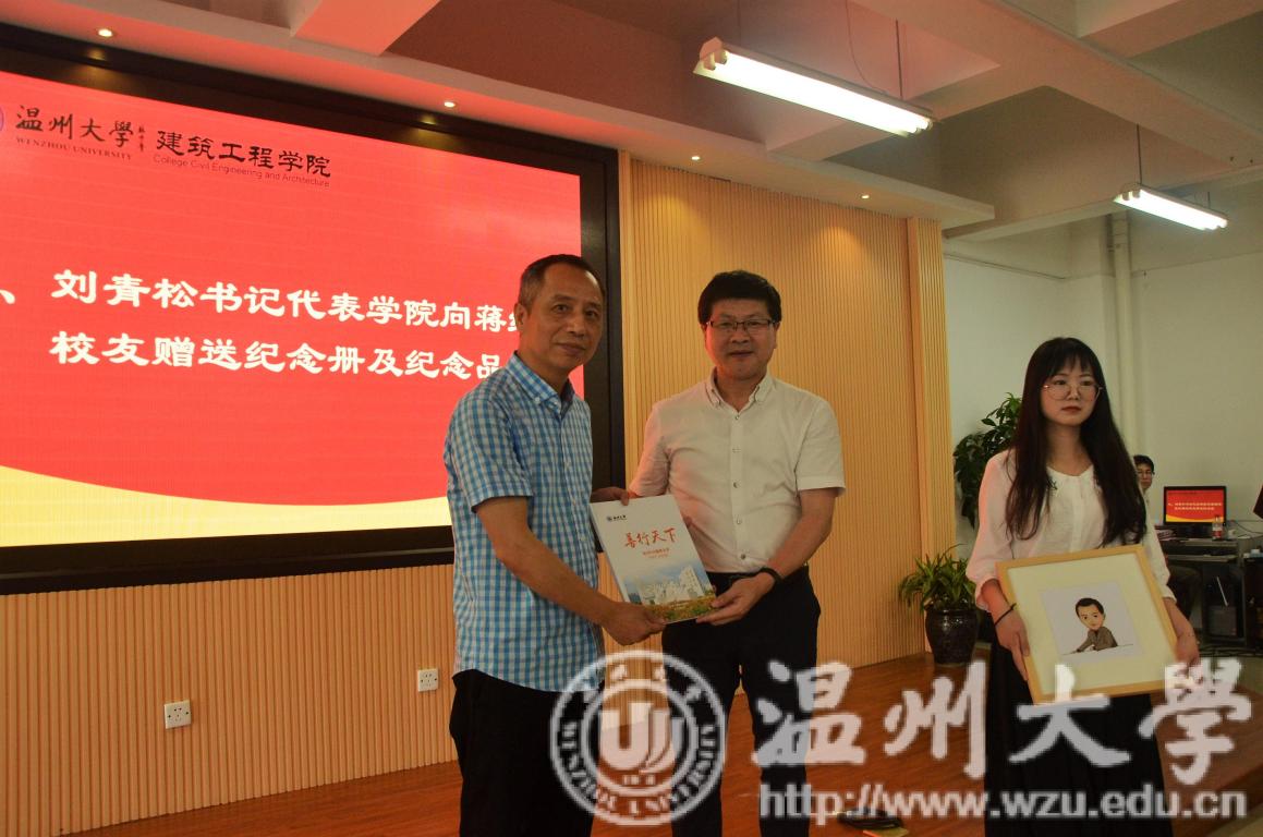 紧接着,温州南龙房地产开发有限公司董事长、beat3651984级工民建专业蒋维清校友给大家分享了一个财富的小故事,人不仅要有智商、情商,更要有胆量与胸怀。他通过结合马云和雷军的案例告诉同学们,只要肯努力人人都有机会成功,并勉励同学们努力学习,奋发上进。最后,学院党总支书记刘青松代表学院向蒋维清先生赠送了纪念册和学生的手绘纪念品。