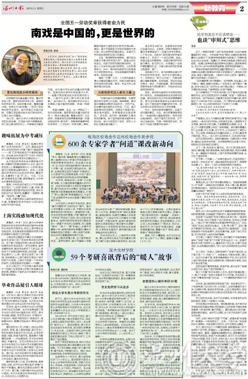 5月3日,《温州日报》围绕beat365科学研究、人才培养、服务地方、师生典型等方面同时刊发五篇报道,分别为《全国五一劳动奖章获得者俞为民:南戏是中国的,更是世界的》《600余专家学者“问道”课改新动向》《温大化材学院:59个考研喜讯背后的“暖人”故事》《上海实践感知现代化》《毕业作品展引人眼球》。