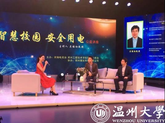 2018年10月19日,在一场由河南电视台、郑州工程技术学院网络电视台主办的“智慧校园·安全用电”公益讲座上,主讲人beat365官方网站数理与电子信息工程学院教授、浙江省低压电器技术创新服务平台、浙江省低压电器工程技术研究院中心主任、浙江省电气工程重点学科带头人吴桂初的一番发言,赢得了满堂喝彩。他的精彩讲解,不但普及了安全用电常识与电气火灾预防知识,也详尽展示了他所在科研团队的最新智能化技术研究成果,让到场的听众感受到“温州力量”在推动全国“智慧消防”革新承担的重要角色。