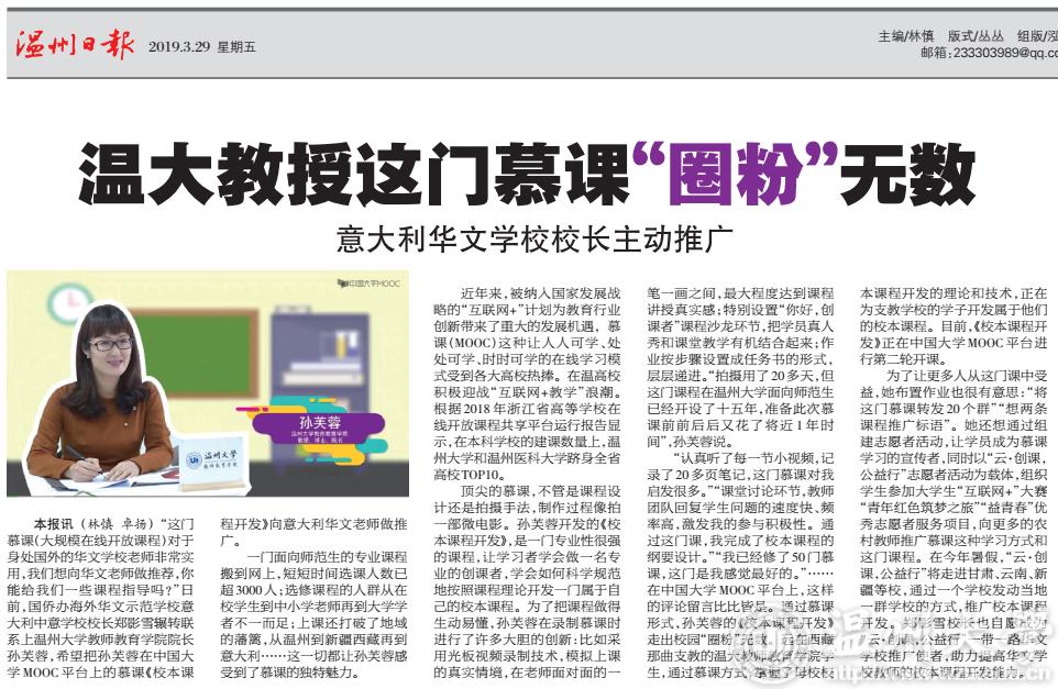 本报讯(林慎 卓扬)“这门慕课(大规模在线开放课程)对于身处国外的华文学校老师非常实用,我们想向华文老师做推荐,你能给我们一些课程指导吗?”日前,国侨办海外华文示范学校意大利中意学校校长郑影雪辗转联系上beat365官方网站教师教育学院院长孙芙蓉,希望把孙芙蓉在中国大学MOOC平台上的慕课《校本课程开发》向意大利华文老师做推广。