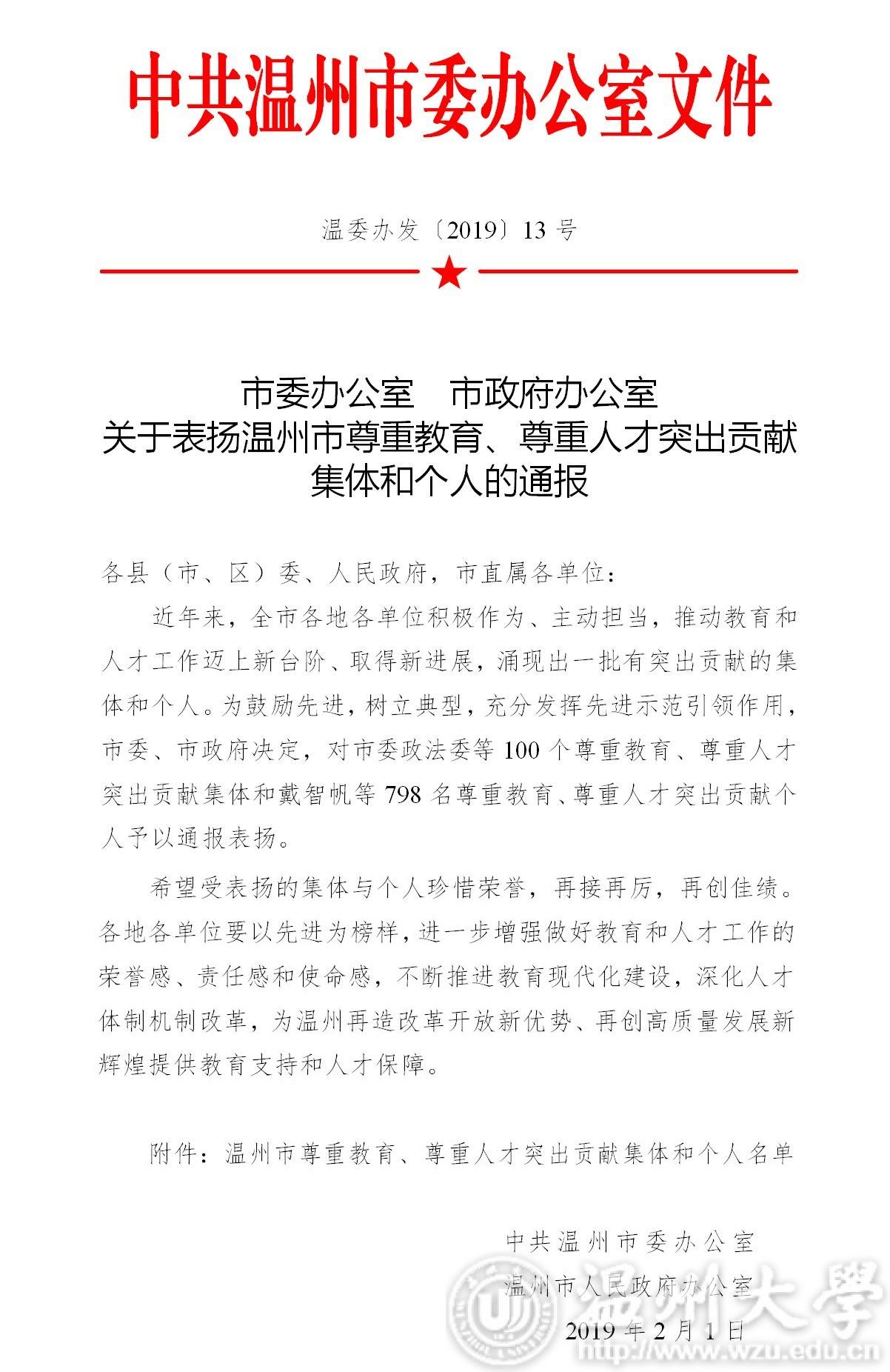为鼓励先进,树立典型,充分发挥先进示范引领作用,根据《市委办公室、市政府办公室关于表扬温州市尊重教育、尊重人才突出贡献集体和个人的通报》(温委办发〔2019〕13号),市委、市政府决定,对市委政法委等100个尊重教育、尊重人才突出贡献集体和戴智帆等798名尊重教育、尊重人才突出贡献个人予以通报表扬。beat365官方网站、beat365官方网站激光与光电智能制造研究院喜获“尊重人才突出贡献集体”荣誉称号,同时,beat365赵燕(教务处)、夏远志(化学与材料工程学院)、蔡丰海(体育学院)、李博(beat365官方网站瓯江学院)等4名教职工荣获“尊重教育突出贡献个人”荣誉称号。