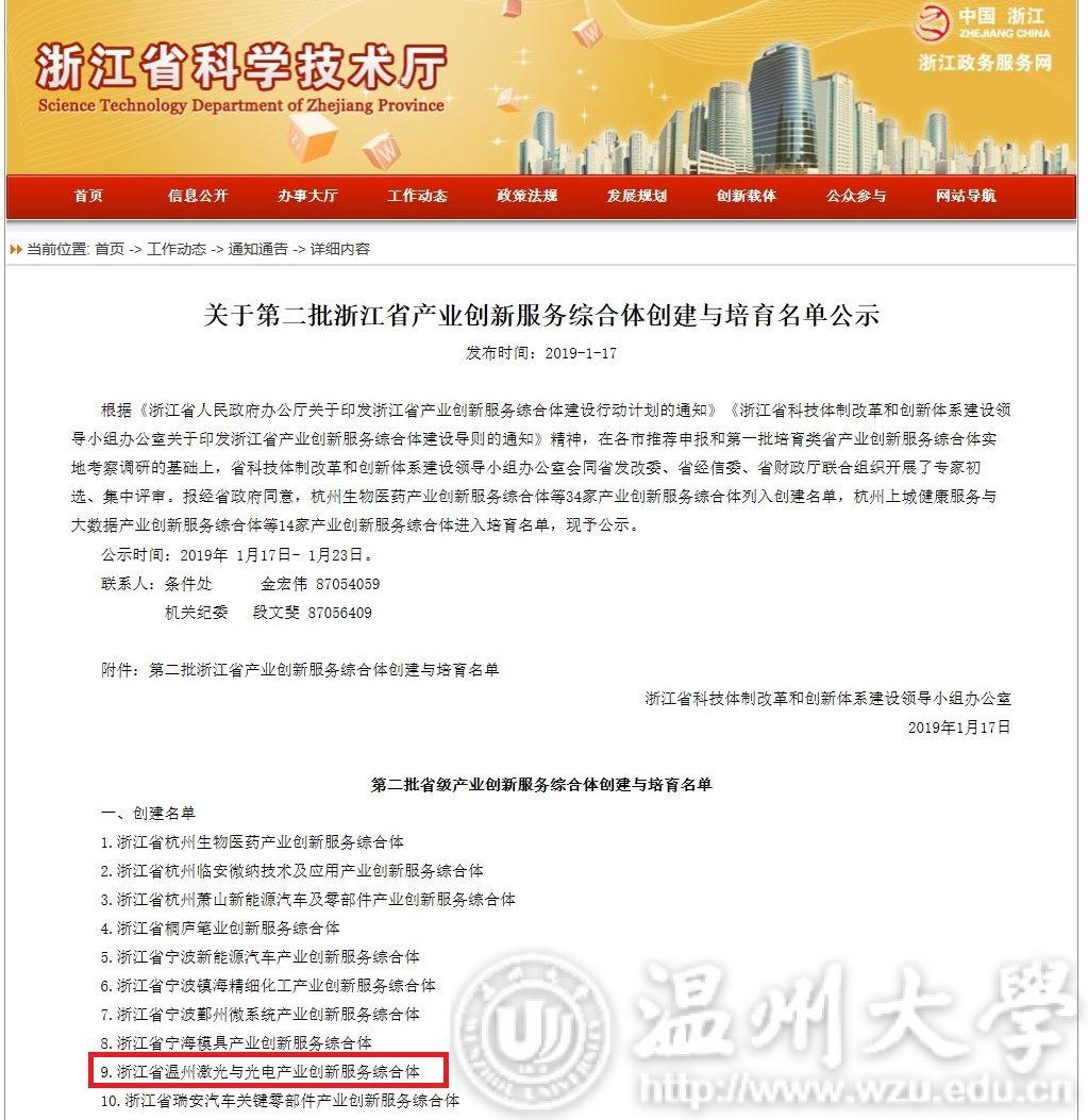 近日,浙江省科技体制改革和创新体系建设领导小组办公室公布第二批浙江省产业创新服务综合体创建与培育名单,beat365激光与光电智能制造研究院作为核心运营单位的浙江省温州激光与光电产业创新服务综合体列入创建名单。